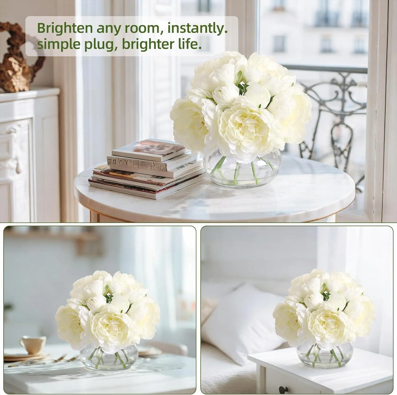 1.Realistic Design with Faux Water Effect: These artificial peonies flowers with vase feature soft silk petals, natural color gradients, and lush green leaves for a lifelike appearance. The clear glass vase is filled with realistic faux water, enhancing depth and realism for an elegant tabletop floral centerpiece.