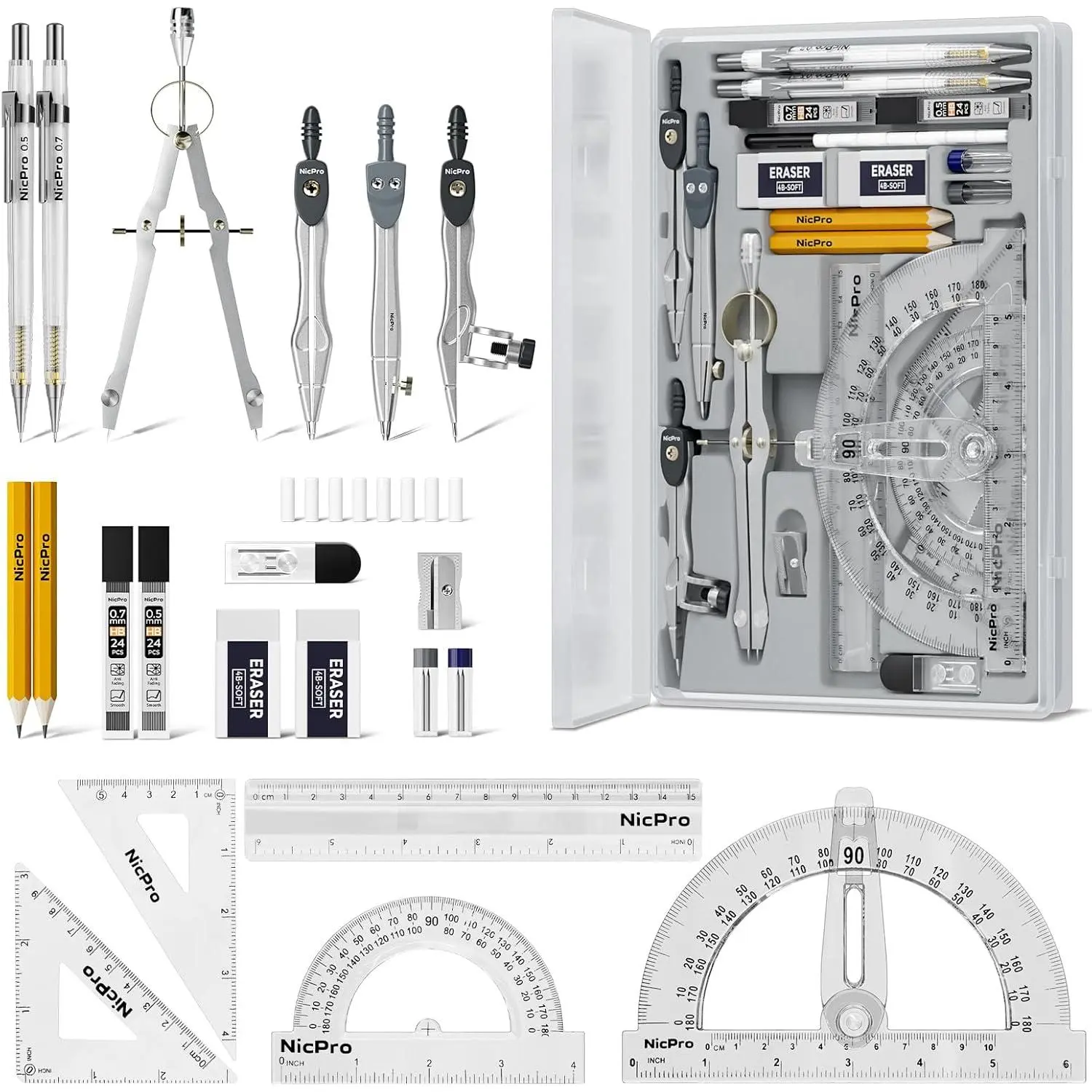 Complete Compass Geometry Set – This all-in-one compass geometry set includes 3 types of compasses (study, graphic, bow), 1 divider, extra lead & needles for compass, 2 protractors (standard and swing arm), a 6" ruler, 2 triangle squares (45°, 30°/60°), 2 mechanical pencils(0.5 & 0.7mm), 2 graphic pencils, erasers, lead refills, and a pencil sharpener, all neatly packed in a durable storage case.Ideal for students for school math or drawing tasksCompasses forSmooth Drawing– High-quality metal compasses designed for accuracy and long-term use, create circles up to 6 inches in diameter.One of the compasses includes an adjustable pen holder, offering greater flexibility for precise arcs and curves in drafting, design, and geometry workDrafting Tools Kit for Students – Equipped with all the drafting tools needed for school or office use, including protractors, ruler, triangle set squares, and mechanical pencils.All tools are clearly marked with inch and centimeter scales, making them practical and easy to use for math, geometry, or engineeringCompact & Portable Design – All geometry tools are securely stored in a lightweight, compact case, making it easy to organize and carry anywhere.This makes the compass geometry set perfect for classroom use, homework, on-the-go study, or professional drafting tasksMulti-Purpose Set – This geometry and drafting tools set is perfect for multiple applications such as schoolwork, exams, architectural sketching, woodworking or artistic design.A thoughtful gift for students during back-to-school, birthdays, holidays, or Children’s Day