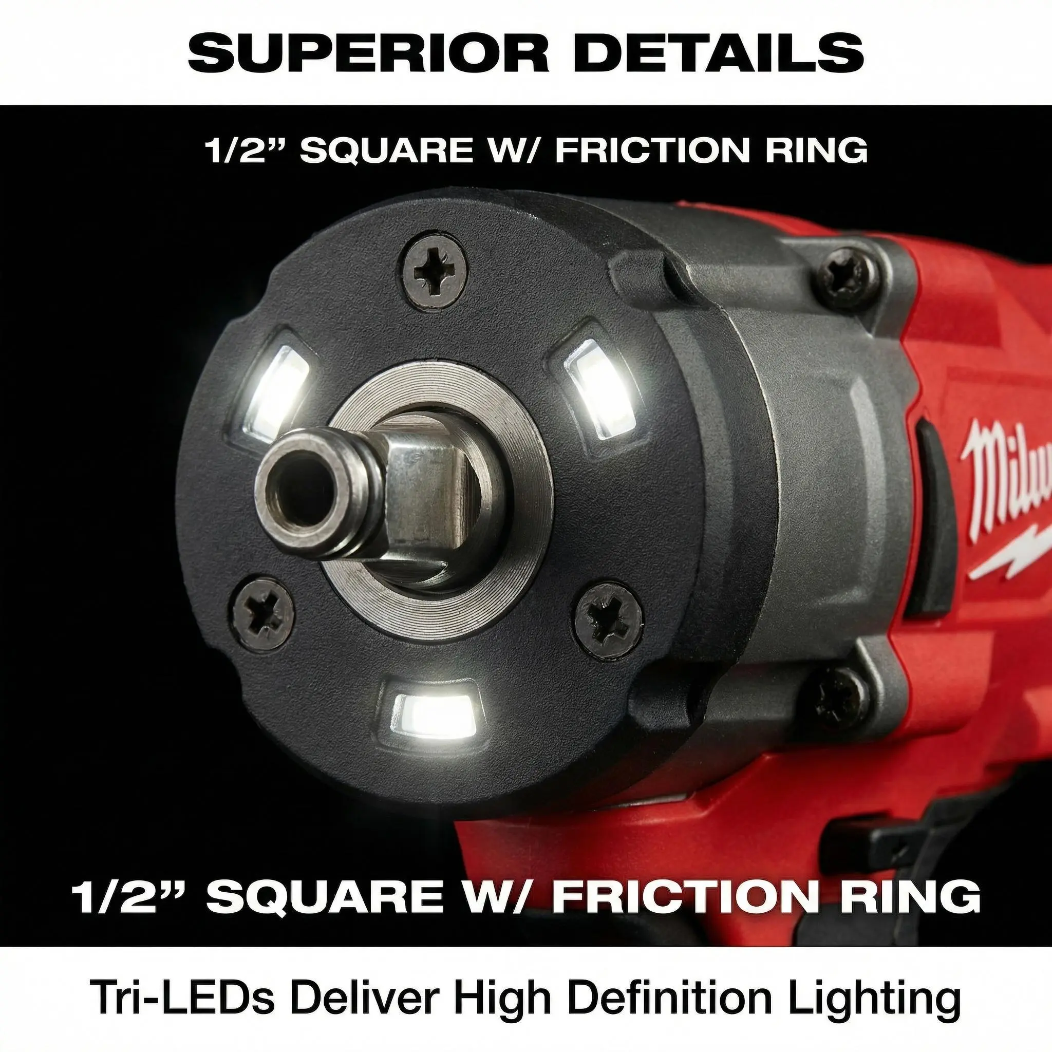 300Nm max breakaway torque. Four speeds: 0-900/1650/2400/1200 RPM. Impact rate up to 3500 IPM. 1/2" friction ring anvil with through-hole design.