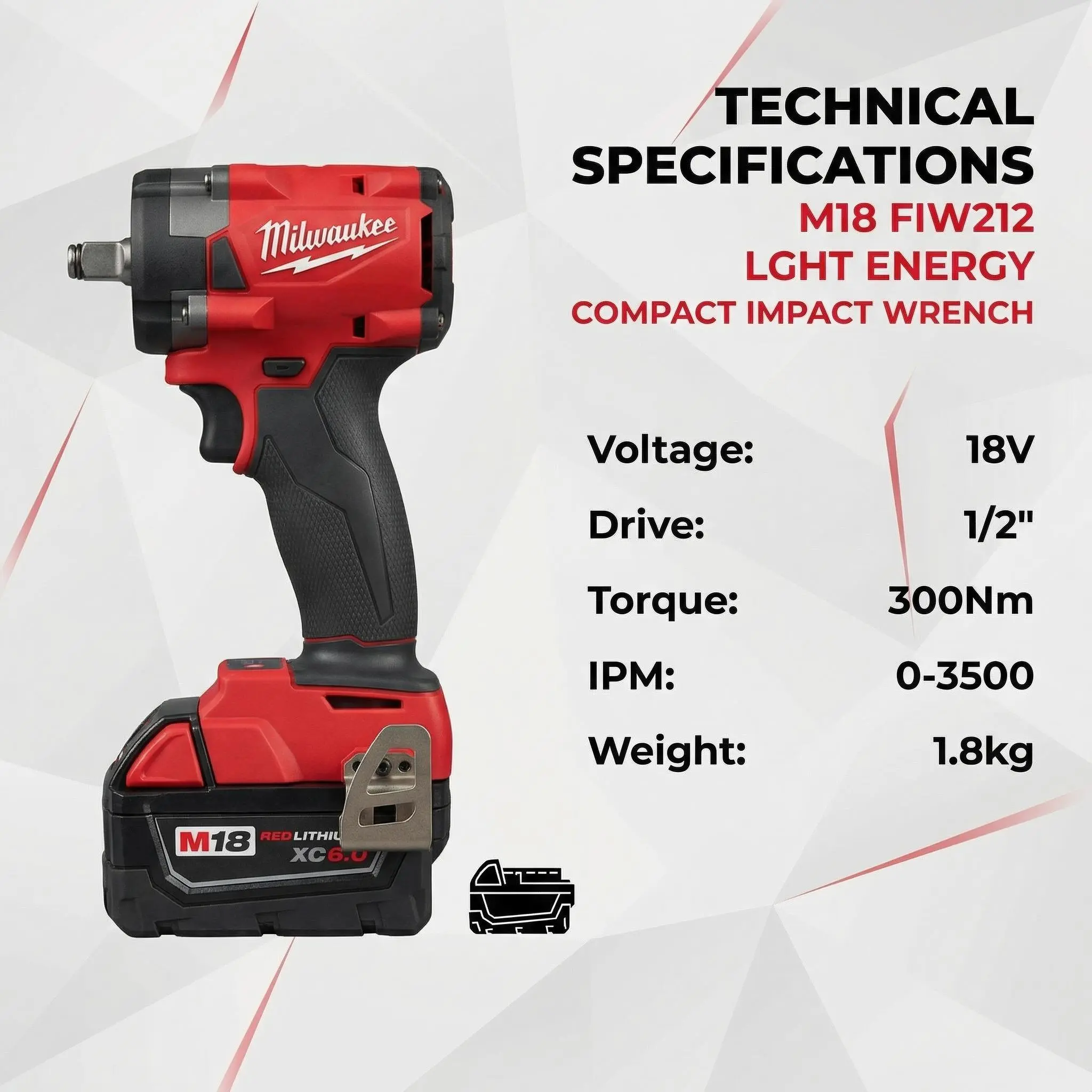 Milwaukee FIW212 1/2" Compact Impact Wrench – 0-2400 RPM, 0-3500 IPM, 300Nm Breakaway Torque – Built for Tight Engine Bays & Assembly Work with 18V Lithium-Ion Battery