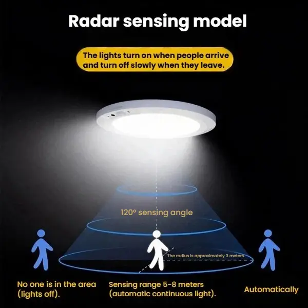 This ceiling light features a motion sensor that detects movement within a 10-20ft range and a 120° angle, automatically turning on when motion is detected and off about 20 seconds after movement stops. It offers three convenient modes: Day-Sensing, Night-Sensing, and Always-On, catering to various lighting needs.