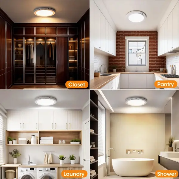 Ideal for areas without wiring, such as closets, pantries, sheds, hallways, porches, bathrooms, and garages. The package contains: 1/2 rechargeable ceiling lights, 1/2 adhesive metal plates, 1/2 USB-C charging cables, 1/2 remotes, 1/2 screw packages, 1 user manual, and 1 packing box.