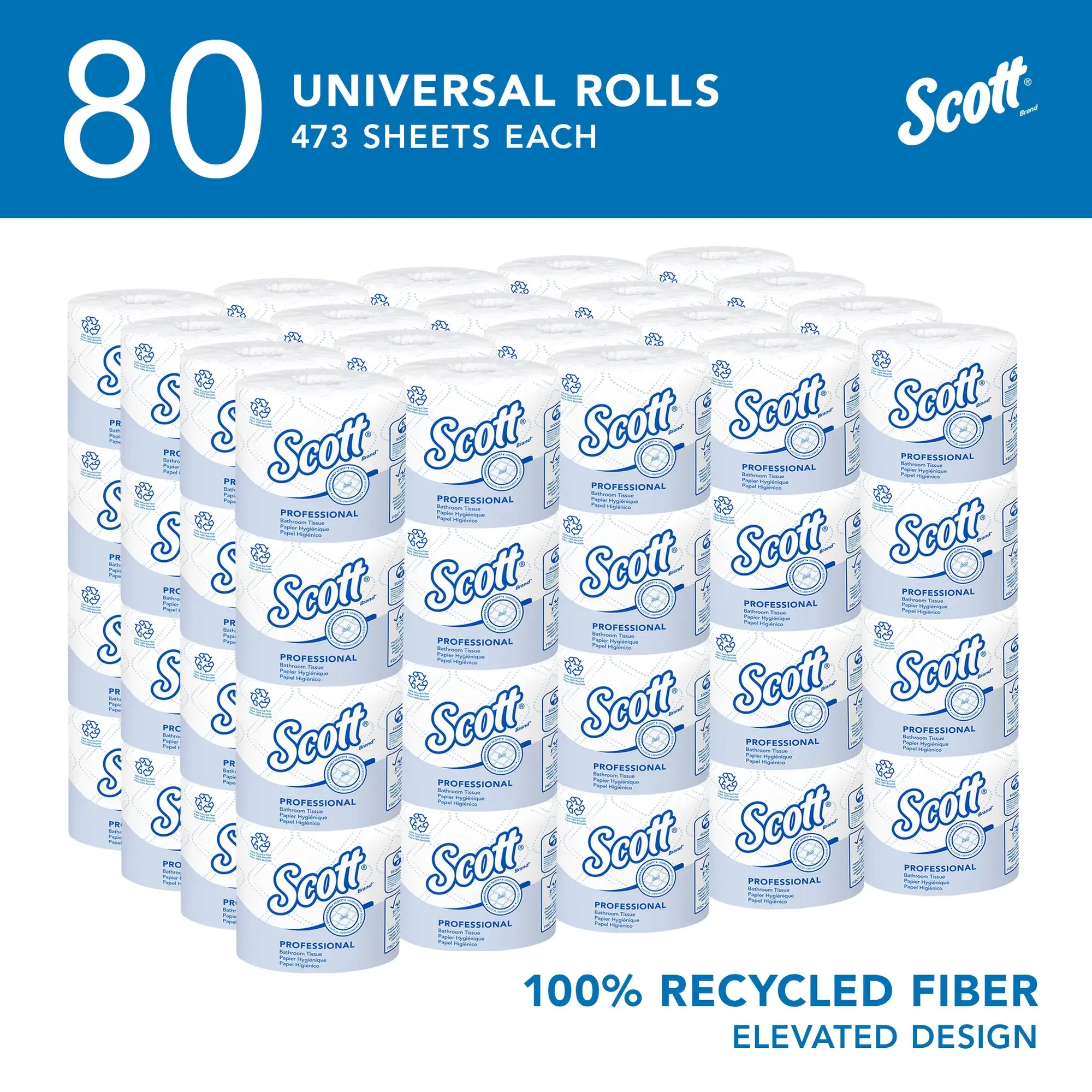 ·473 Sheets/Roll; 80 Rolls of Scott Professional 100% Recycled Fiber Standard Roll Toilet Paper Rolls/Case; 37,840 Sheets/Case; with Elevated Design; 2-Ply; White; Individually wrapped rolls