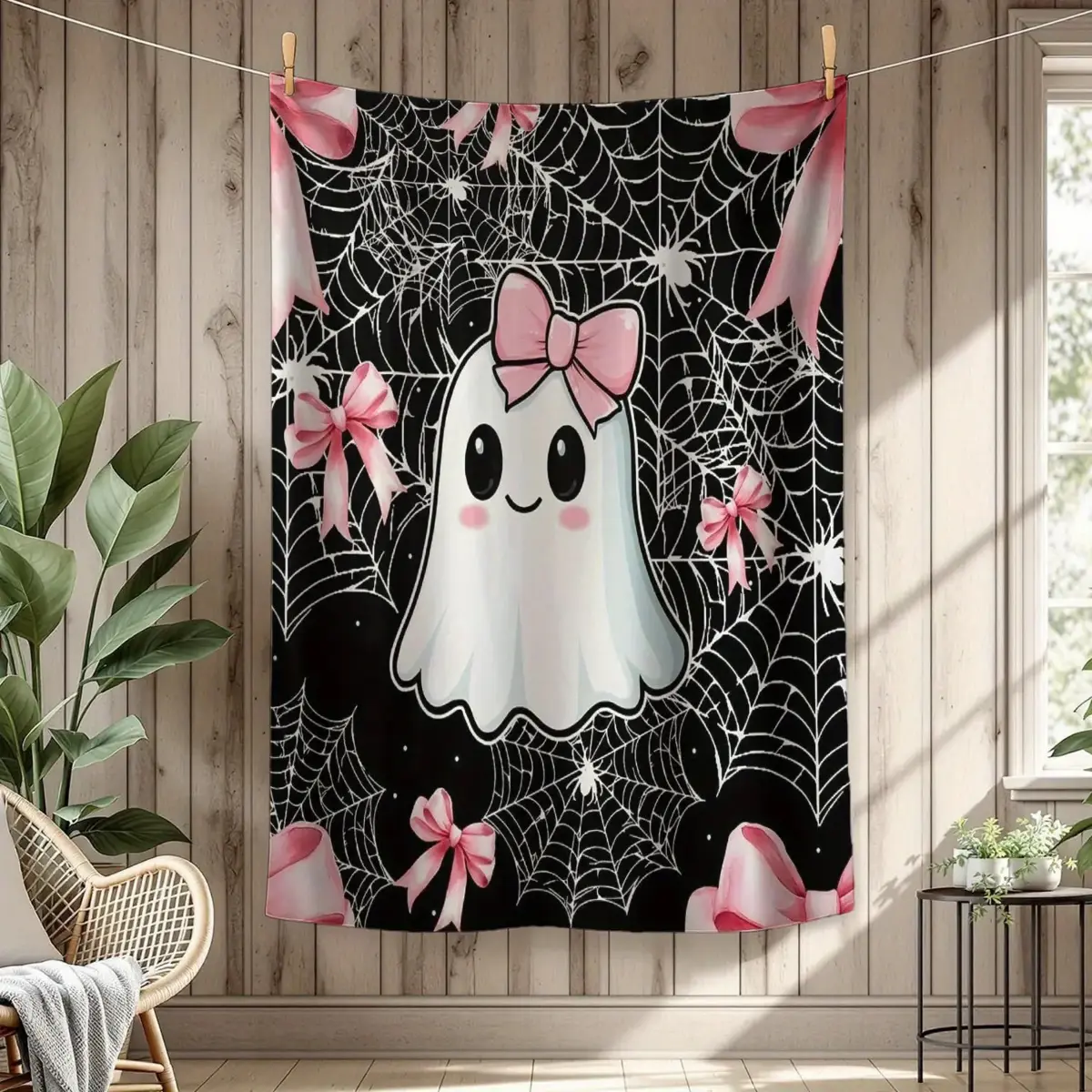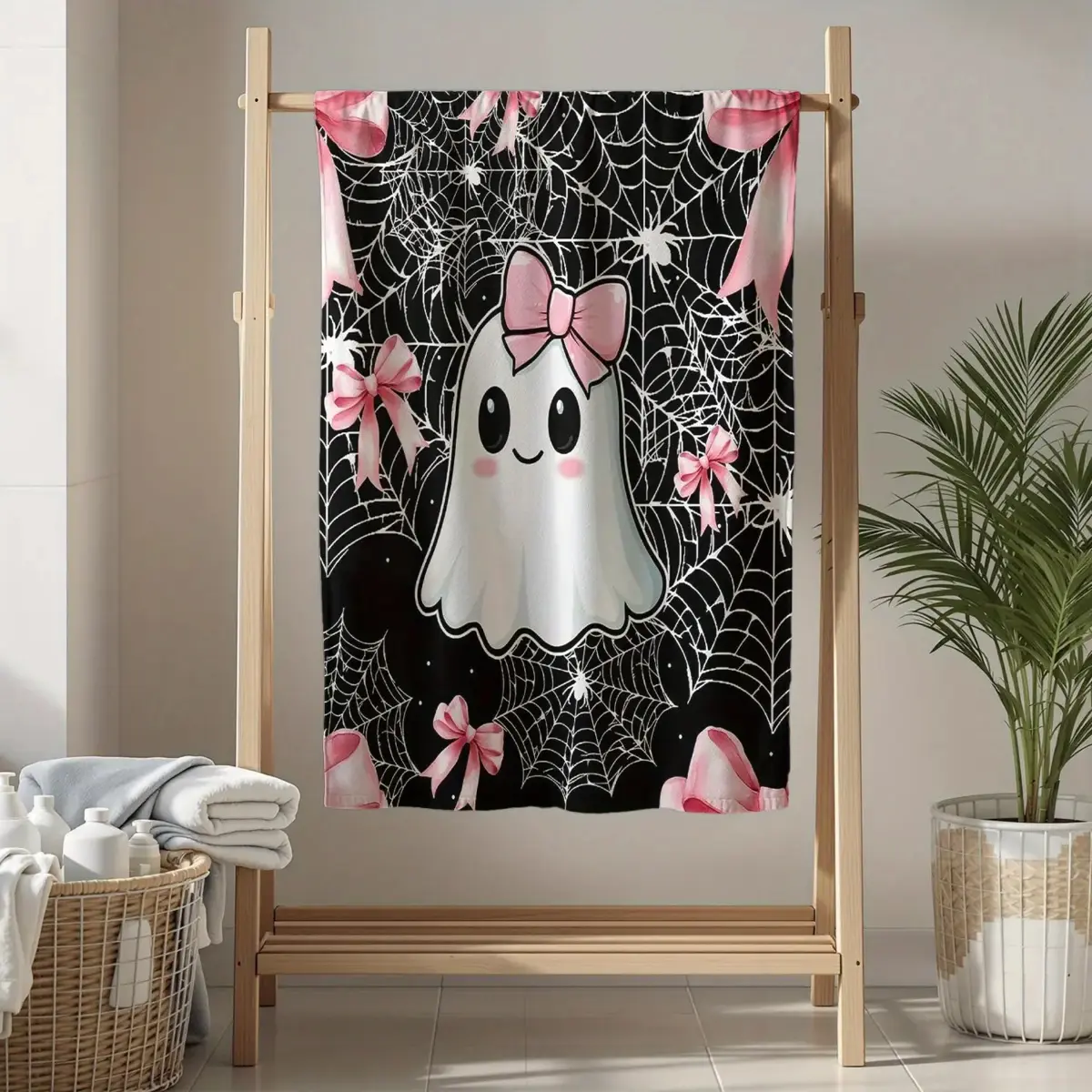 1 Piece Halloween Ghost Pink Bow Spider Web Theme Flannel Blanket, Soft and Warm Plush, Super Comfortable, Suitable for Living Room, Bedroom, Travel and Camping, Family Holiday Decoration,Air-conditioned Room Accessory