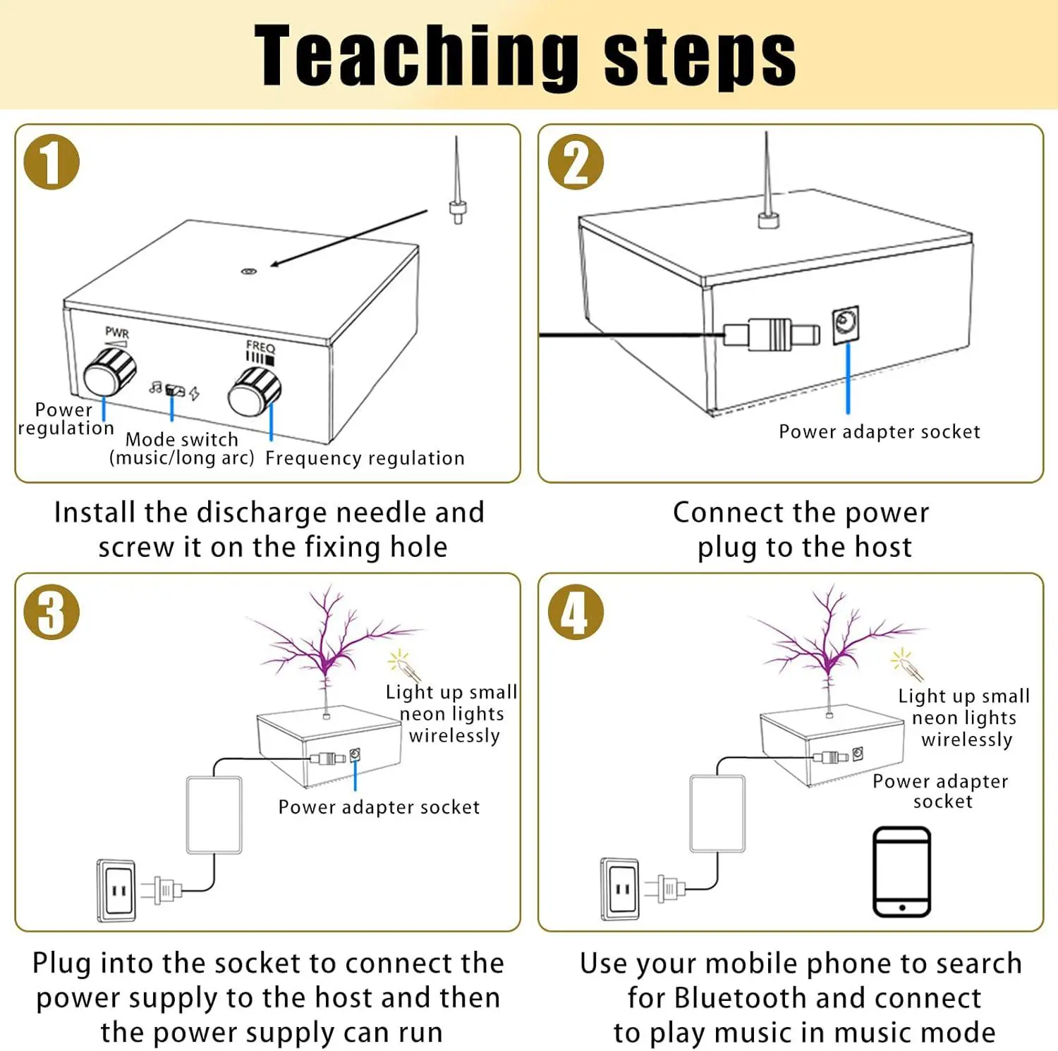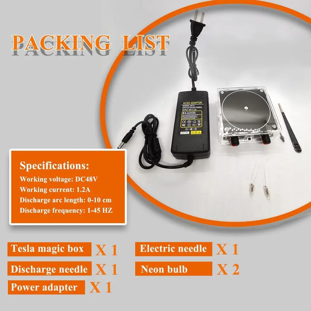 Comes with everything you need to get started: Tesla magic box ×1, electric needle ×1, discharge needle ×1, neon bulbs ×2, and power adapter ×1. The unit comes pre-assembled, so you can plug it in and start exploring right away without complicated setup.