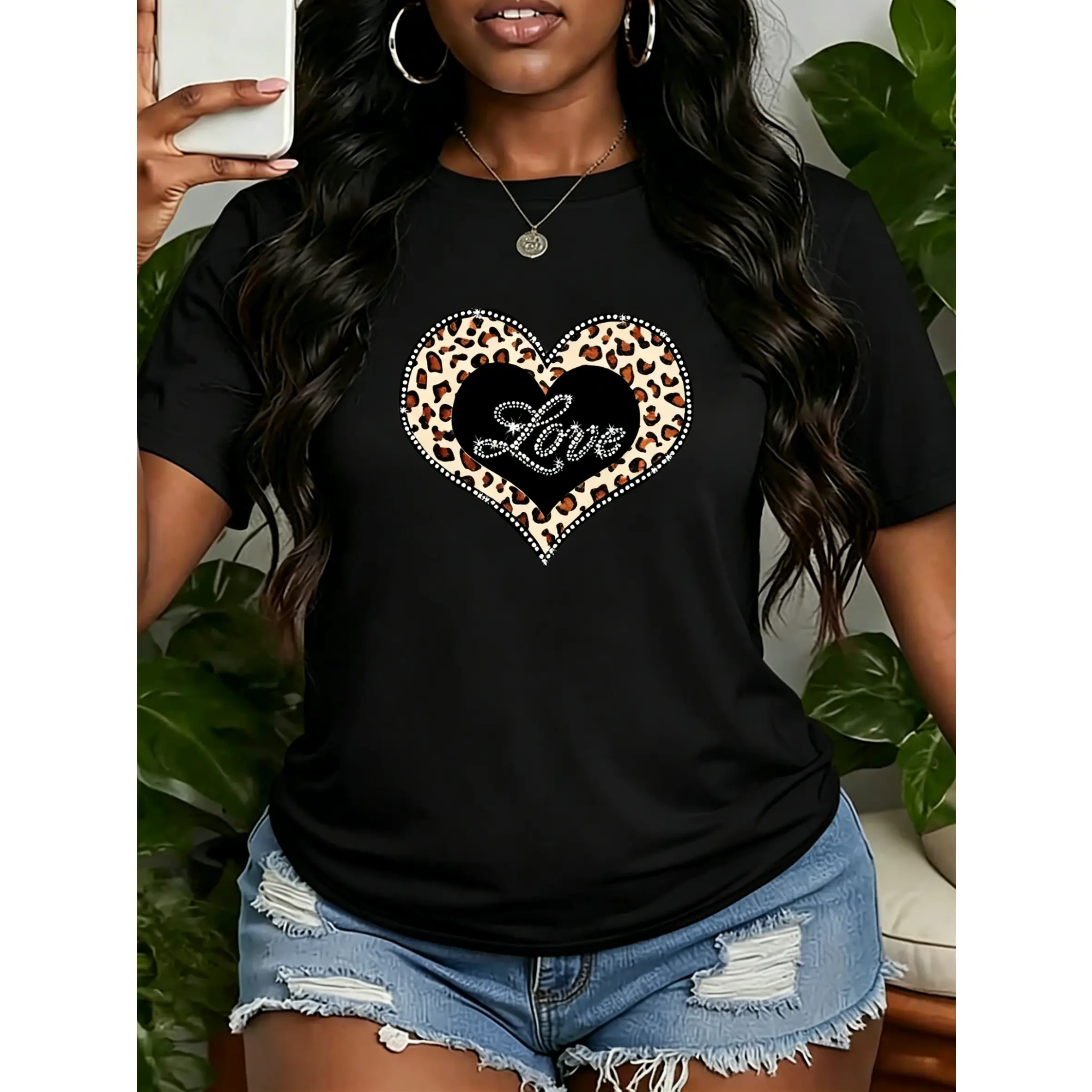100% cotton women's short-sleeve top with leopard print, heart-shaped rhinestones, "Love" letter print in a light luxury style, round neck, comfortable and soft, breathable, new recommended style, loose fit, casual, trendy, fashionable, simple versatile