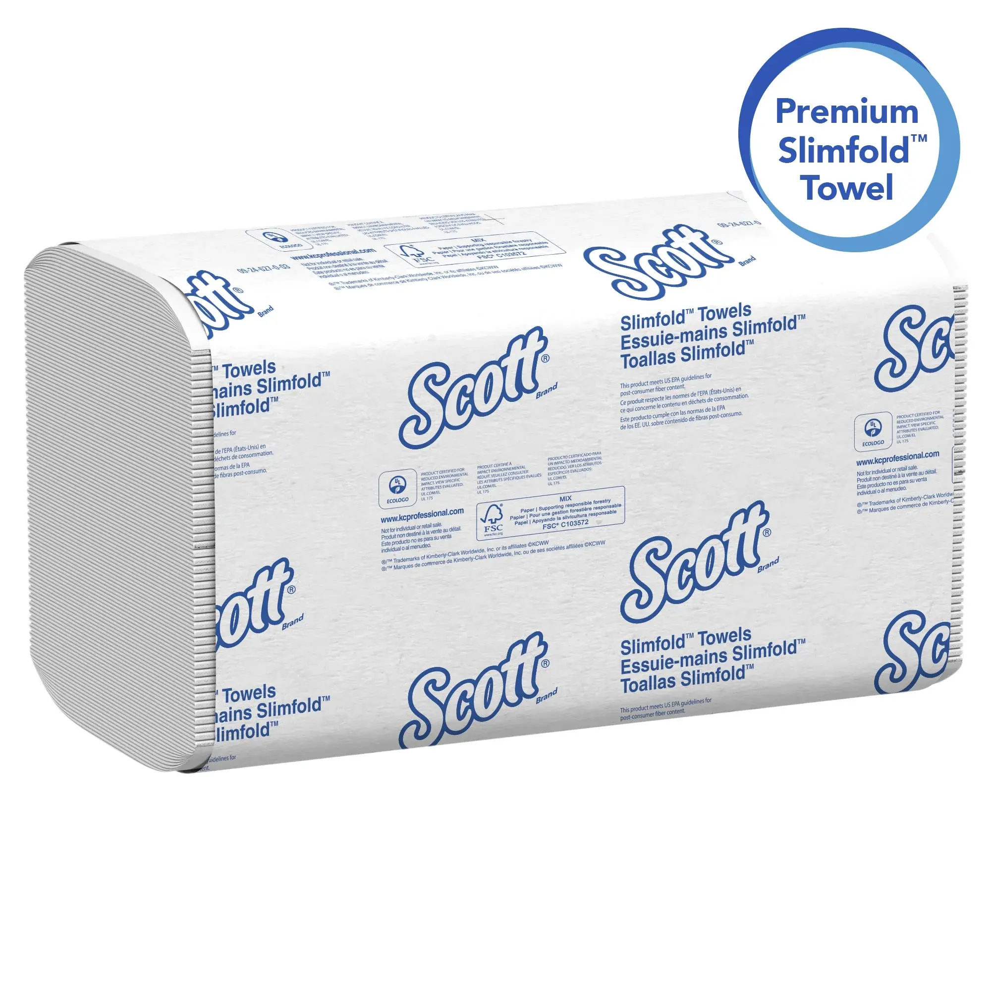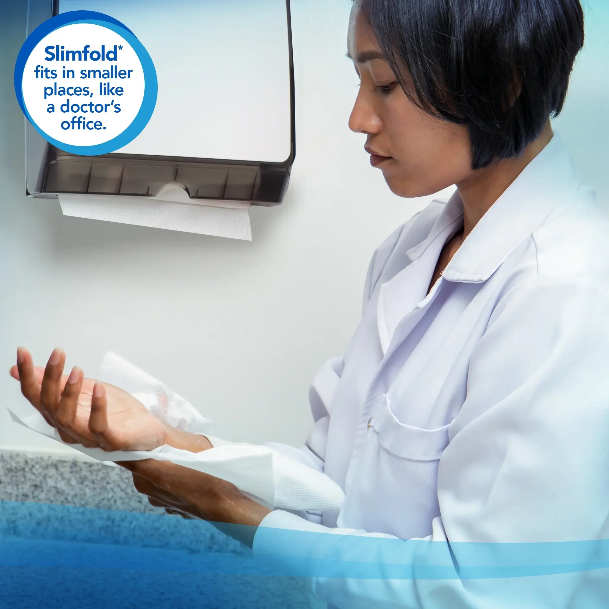 Scott provides enhanced hygiene solutions for critical environments. Sometimes the littlest things make the biggest difference. With Scott Slimfold Paper Towels, the innovative design means that you can fit premium paper towels in places you may have never thought possible. Now, thanks to a smart fold design (it's smaller than typical m fold, c fold or tri fold hand towels) you can fit a compatible slim dispenser in tight places like a nurses' station, a small classroom washing area, or a behind-the-counter sink at your business. These Scott high-performance towels feature exclusive Absorbency Pockets (fast-drying ridges deliver better absorbency) and are folded five times instead of two (like many multi-folds). Don't let the small fold size fool you, though: each towel unfolds to 7.5" x 11.6", giving you enough towel to get the job done. Find a compatible Kimberly-Clark Professional dispenser, which will help keep your towels clean prior to use and deliver one-at-a-time dispensing for hygienic hand drying (only touch the towel you use). Thanks to the slim size there's also reduced packaging size, which allows for easy storage of extra towels in cabinet or closets – without the need for bulky boxes. Scott Slimfold Paper Towels provide superior hand-drying performance and user satisfaction – it's the name that says premium quality and homelike comfort, no matter how much space you have.