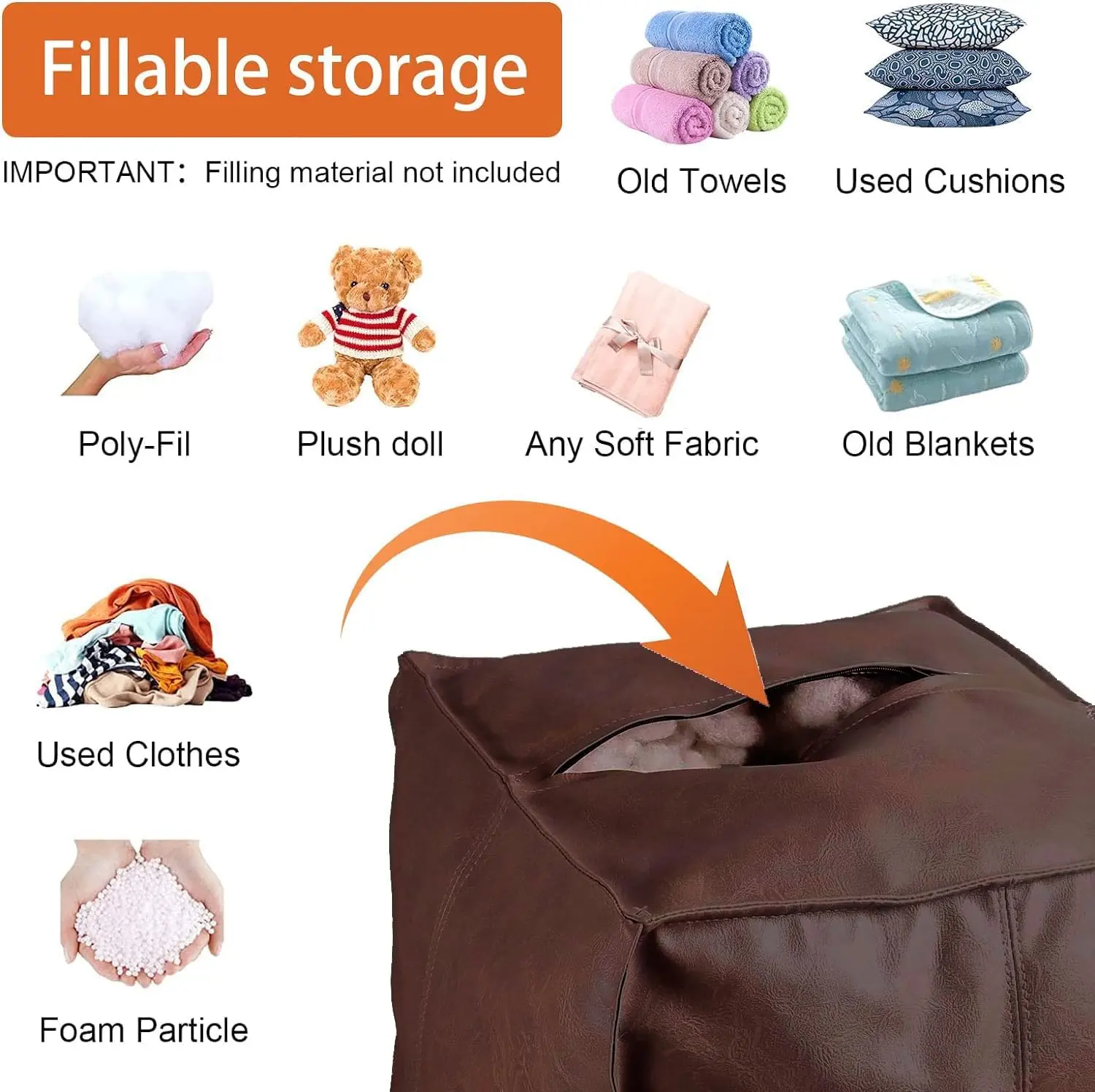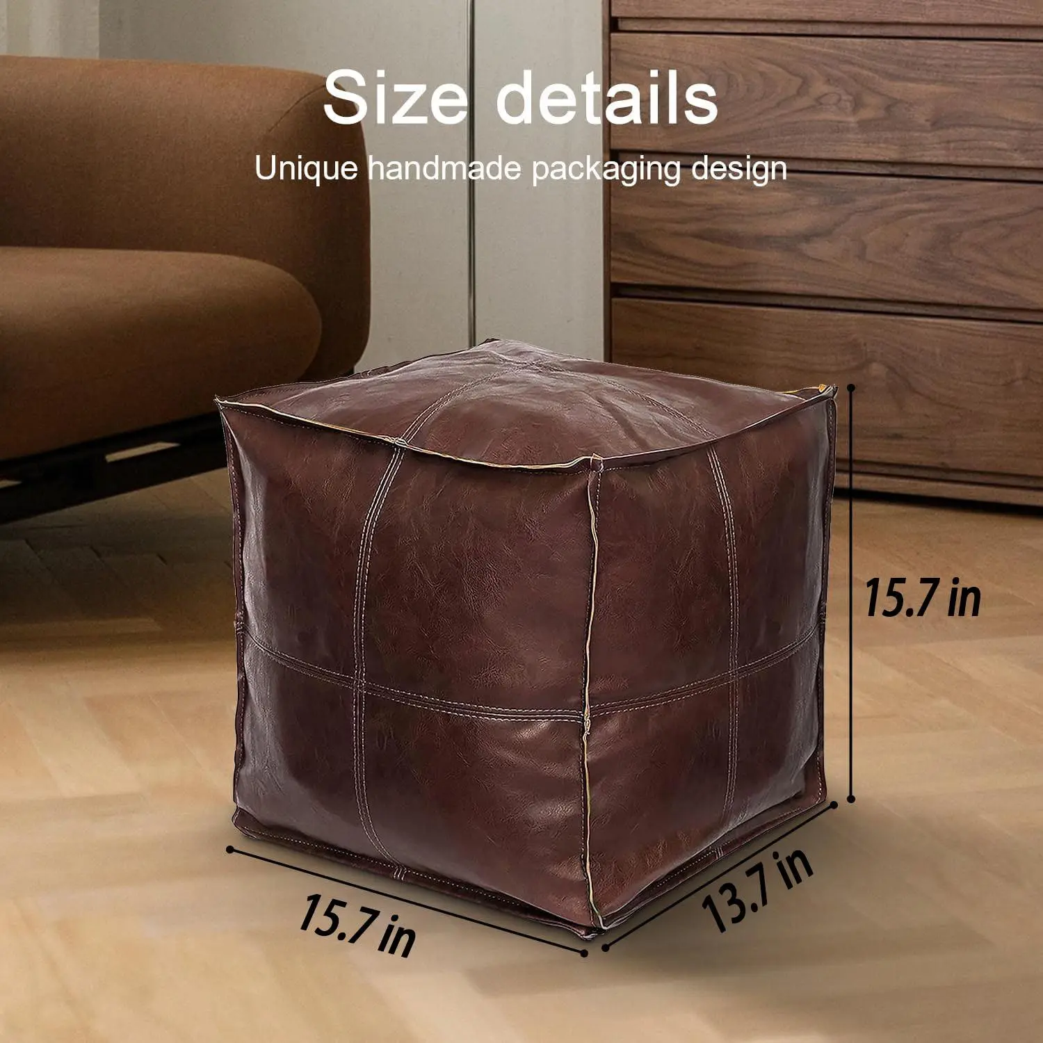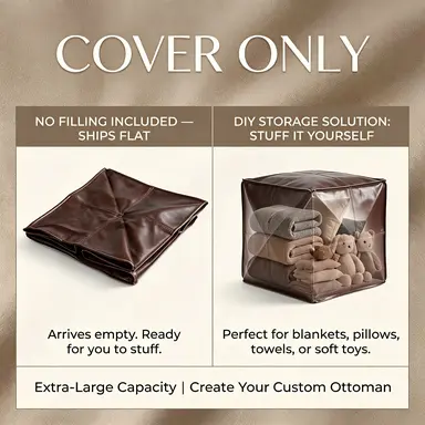 15.7-inch square ottoman cover needs to be filled, an artificial leather storage DIY ottoman with a zipper, scratch-resistant and easy to clean. Suitable for living rooms and bedrooms. Can store clothes and blankets. Home decor sofa furniture.