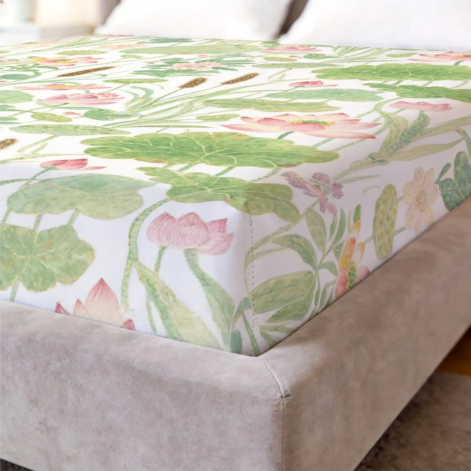 5. 3 Piece Watercolor Lotus Pond Fitted Sheet Set, HD Digital Printed Deep Pocket Bed Sheet, Soft Breathable Bedding Set with Pillowcases (No Insert) for Bedroom Home Decor