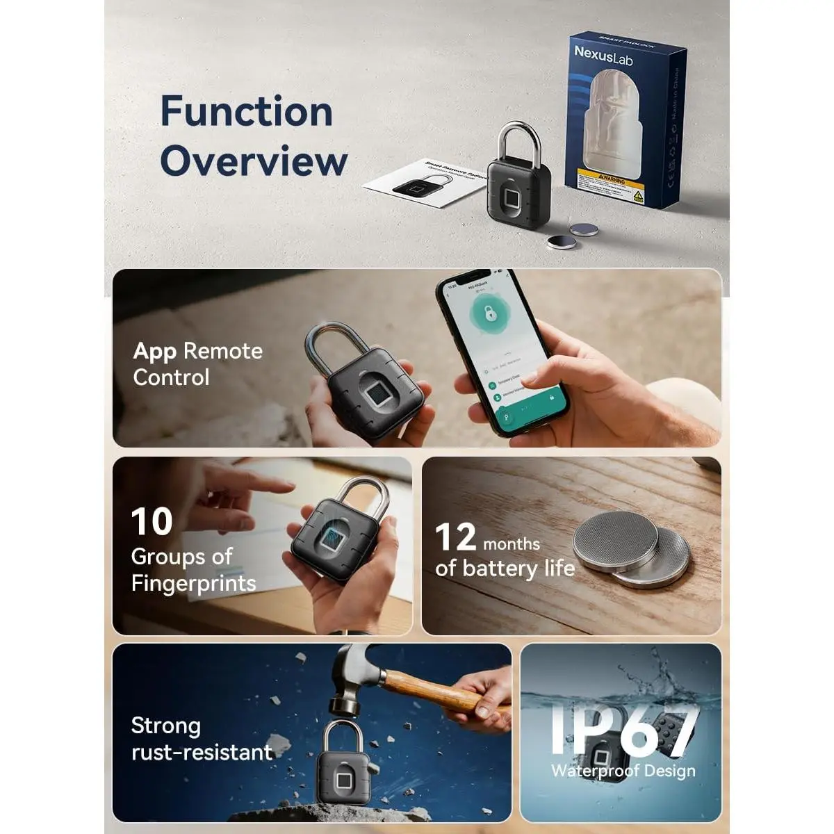[Dual Unlock Modes] Seamless access via registered fingerprints or the TUYA Smart App (Bluetooth-enabled), eliminating keys/passwords[All-Weather Protection] IP67 waterproof & dustproof design, operates in -20°C to 55°C (-4°F to 131°F), withstands daily rain/humidity[1-Year Extended Battery] Dual CR2032 batteries with smart low-battery alerts.Fingerprint data remains intact during battery replacement[Reinforced Security] Anti-pry stainless steel lock + zinc alloy housing.Stores 10 unique fingerprints to block unauthorized access[Child-Safe Certified] Dual-protection battery compartment with warning labels, compliant with anti-swallowing safety standards[Multi-Scenario Compatibility] Perfect for homes, offices, gym lockers, travel luggage, and outdoor gates – ideal for domestic/business/mobility needs[Worry-Free Support] 90-day no-questions-asked refund policy + 24/7 professional customer service team[Warm Tip]For a smoother unlocking experience, it is recommended to align the center of your thumbprint with the fingerprint recognition module.This ensures the most accurate recognition and faster unlocking.