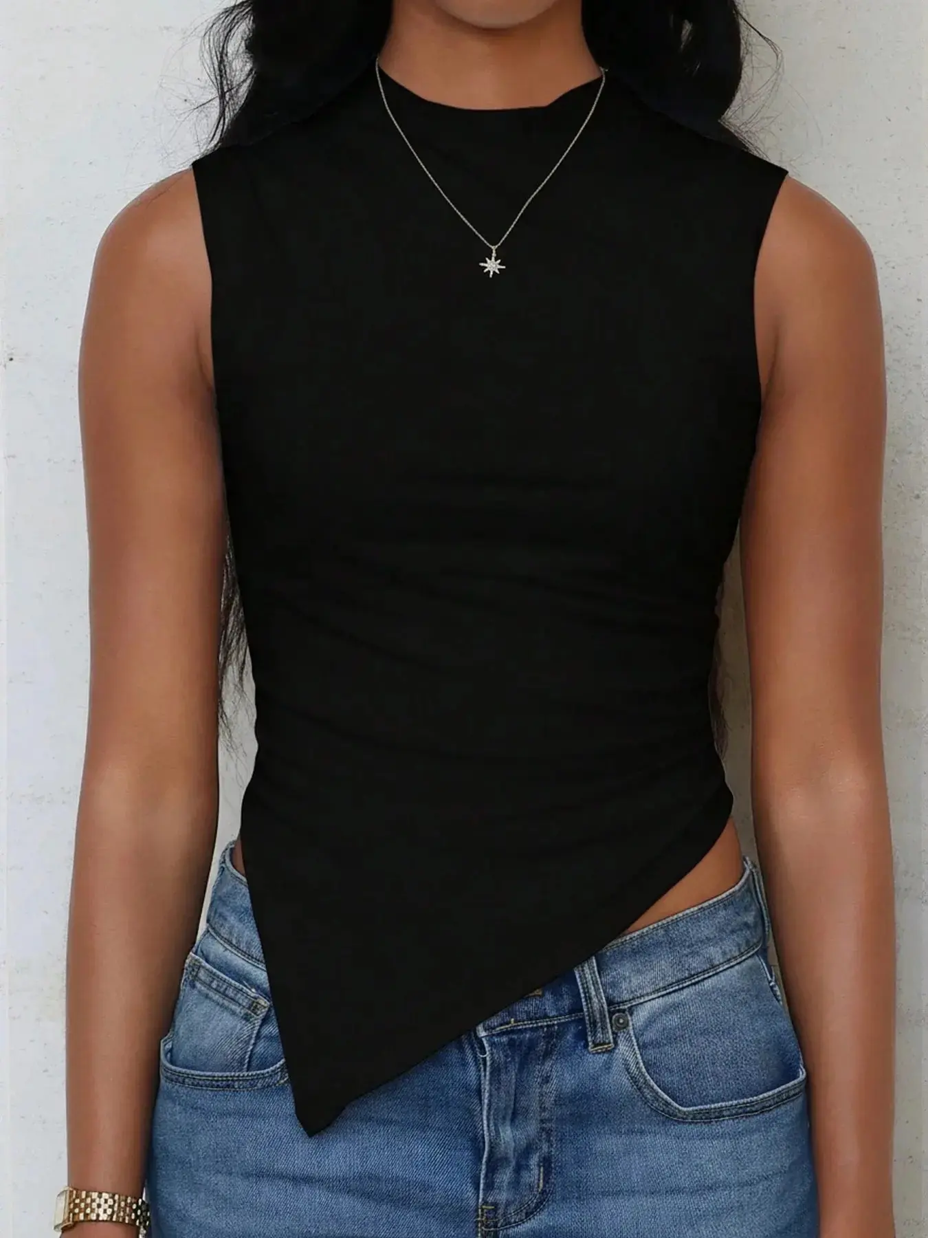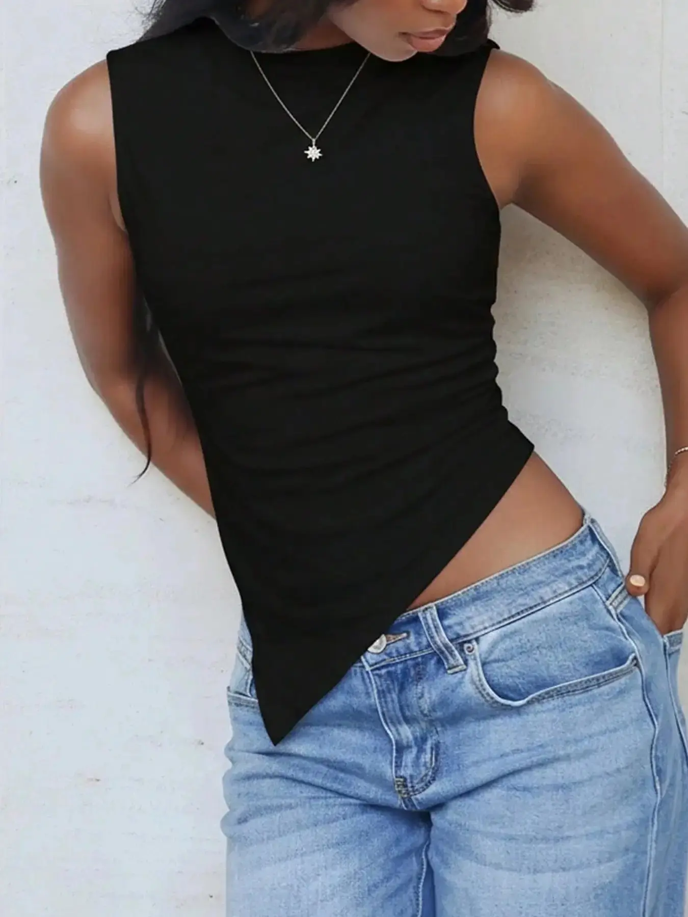 [Asymmetric Hem]: Features a unique asymmetric hem that sets it apart from traditional tank tops, adding a modern twist.