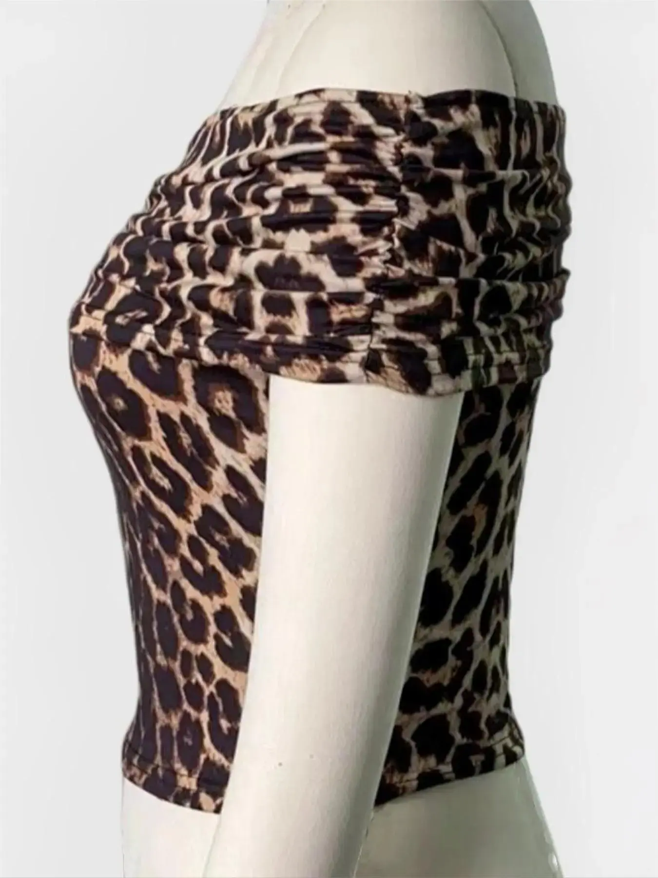 Women's Leopard Print Off Shoulder Crop Tee, Y2K Sexy Vintage Fit Slim Casual T-shirt for Daily Wear, Ladies Clothes for Summer, Womenswear, Top