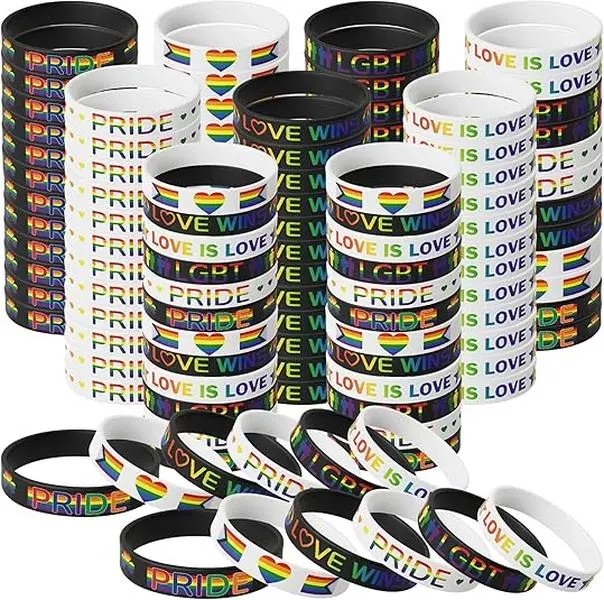Show your unwavering support for the LGBTQ+ community with this powerful 120Pcs Pride LGBT Silicone Bracelet Set! This bulk set features an array of vibrant silicone wristbands in classic black, white, and rainbow hues, emblazoned with the iconic slogans "PRIDE", "LOVE IS LOVE", and "LOVE WINS", alongside the beloved rainbow heart symbol.