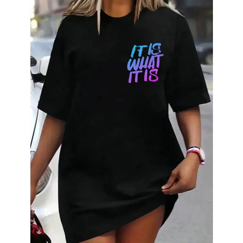 Plus Size Women's T-Shirt - Breathable Round Neck Short Sleeve Casual Top with "It Is What It Is" Gradient Print, Lightweight 180gsm Fabric for Spring/Summer, Black