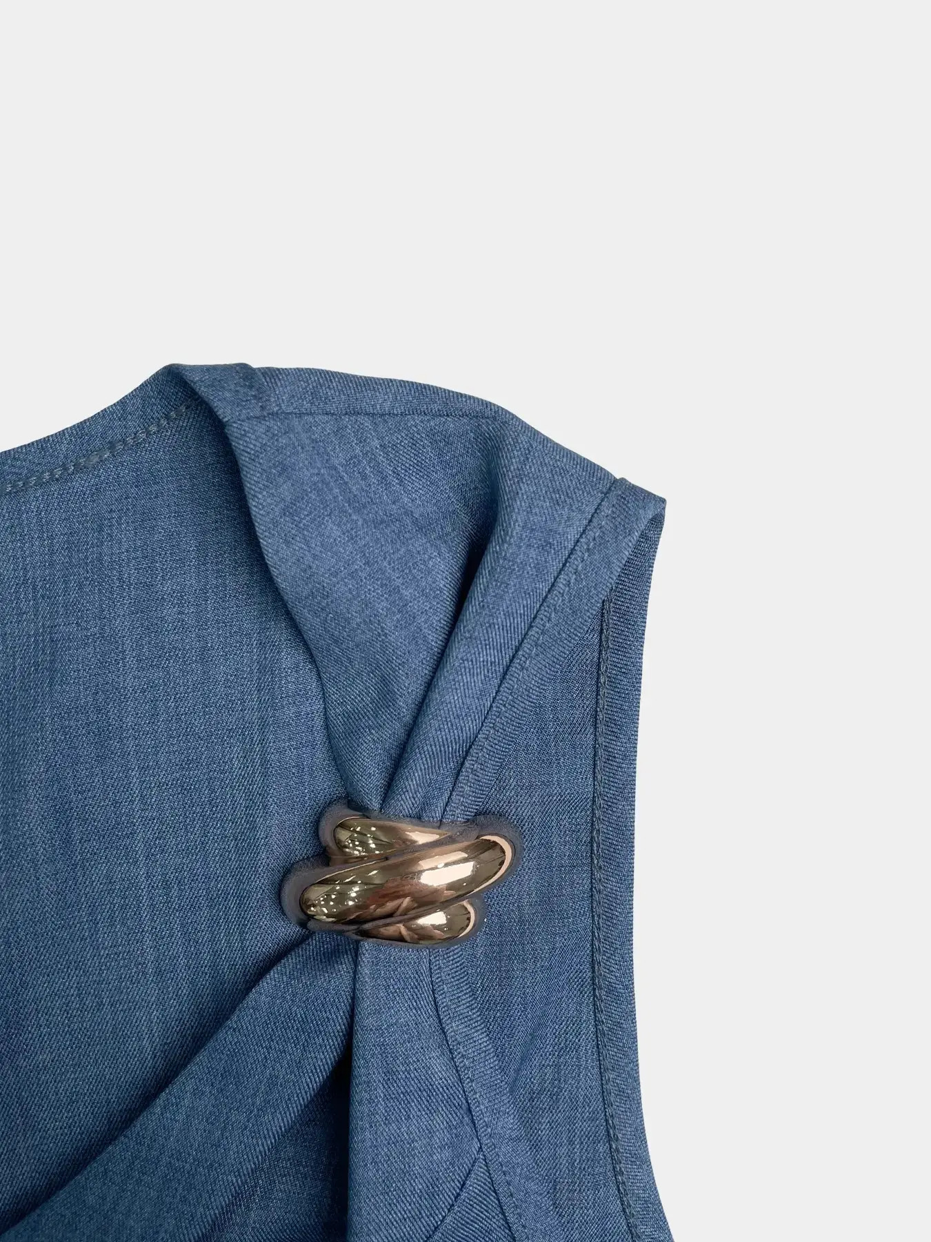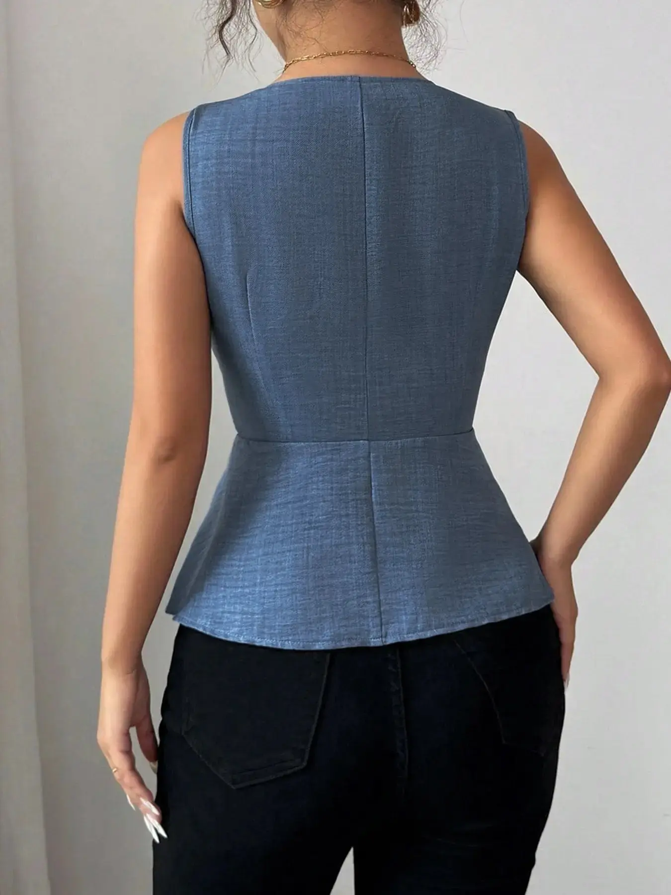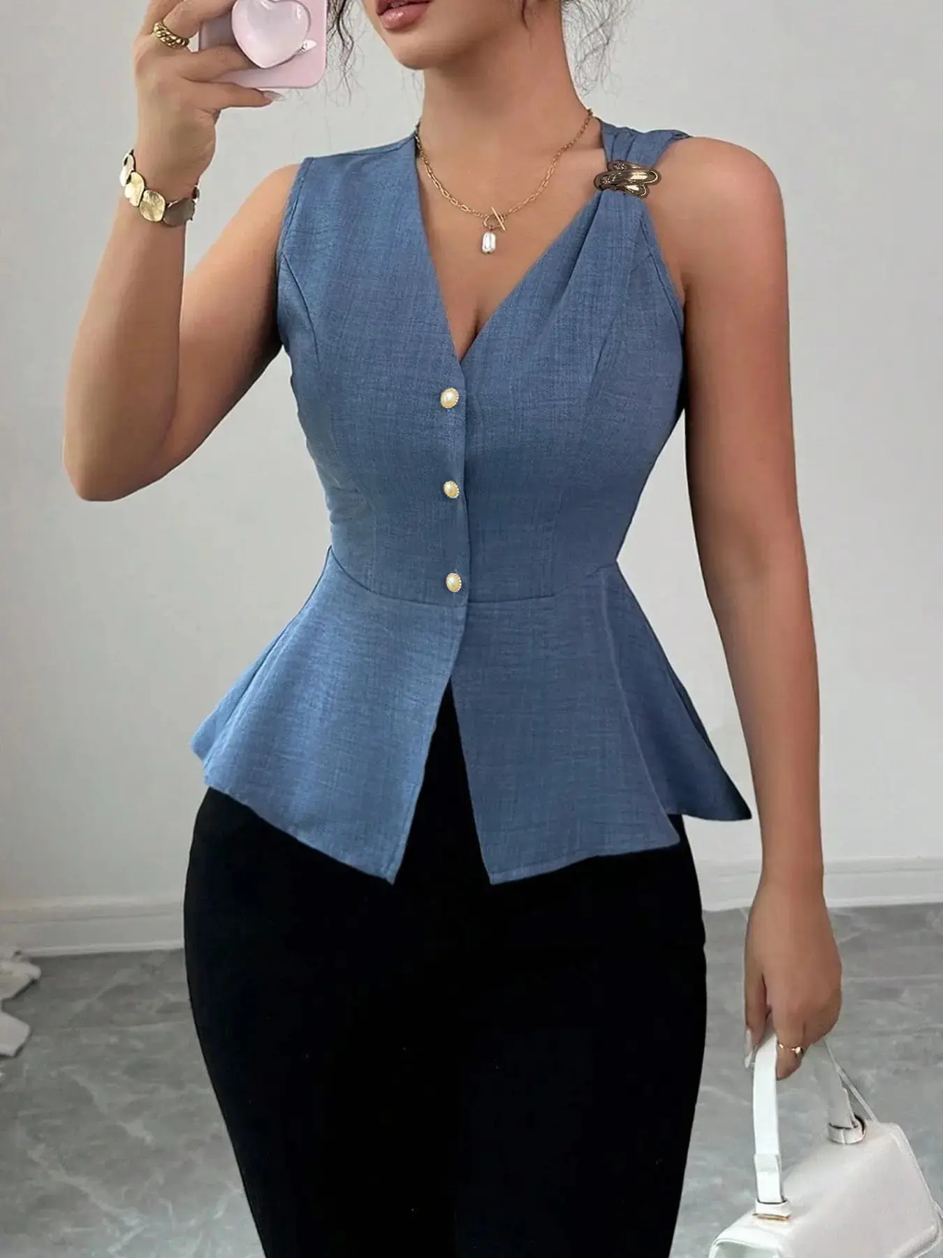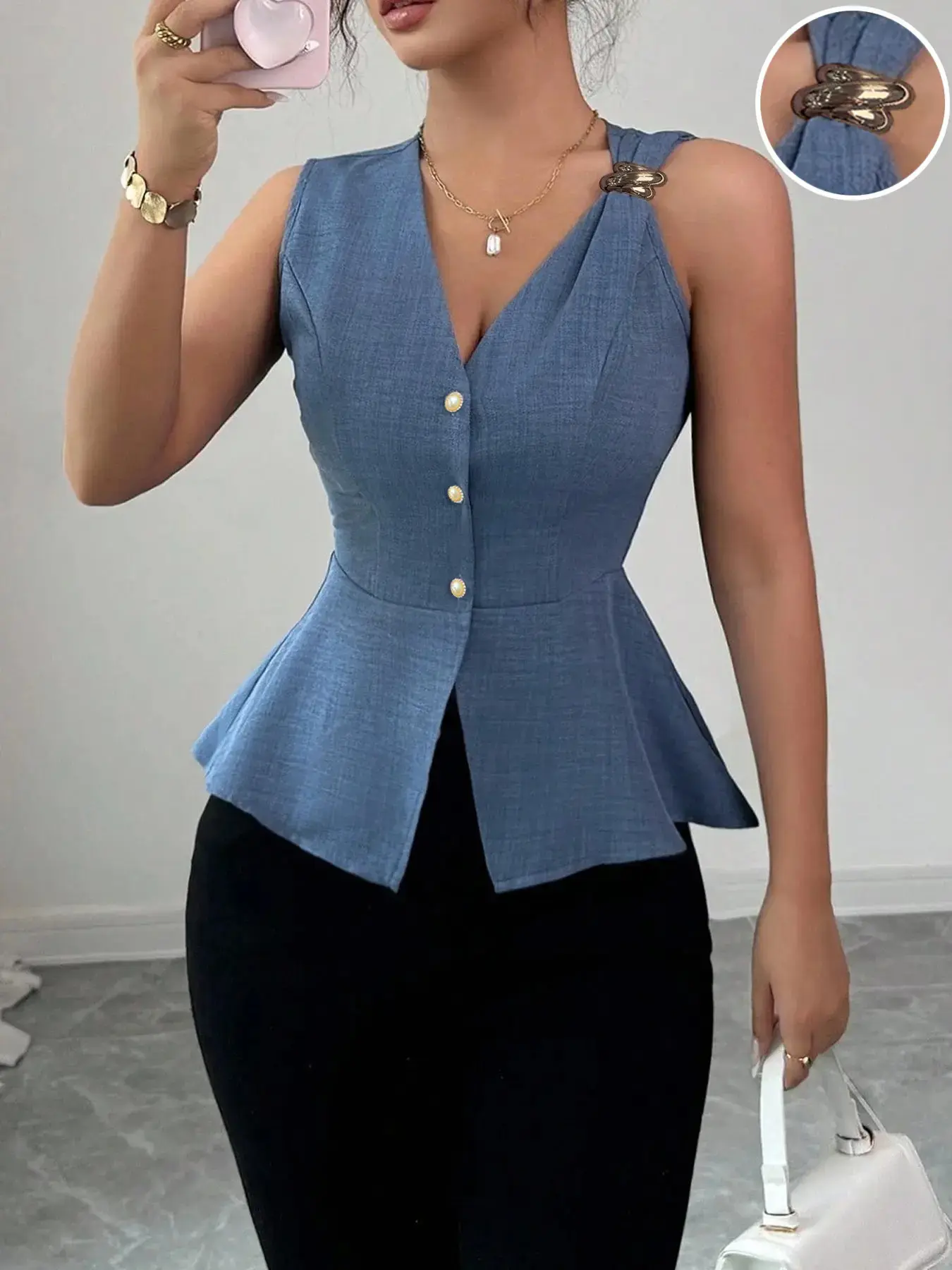 Women's Solid Color V-Neck Sleeveless Blouse Top, Metal Buckle Detail, Peplum Hem, Waist-Flattering Cut, Breathable Fabric, Office & Casual Summer Wear, Elegant Tailored Style,1 Piece