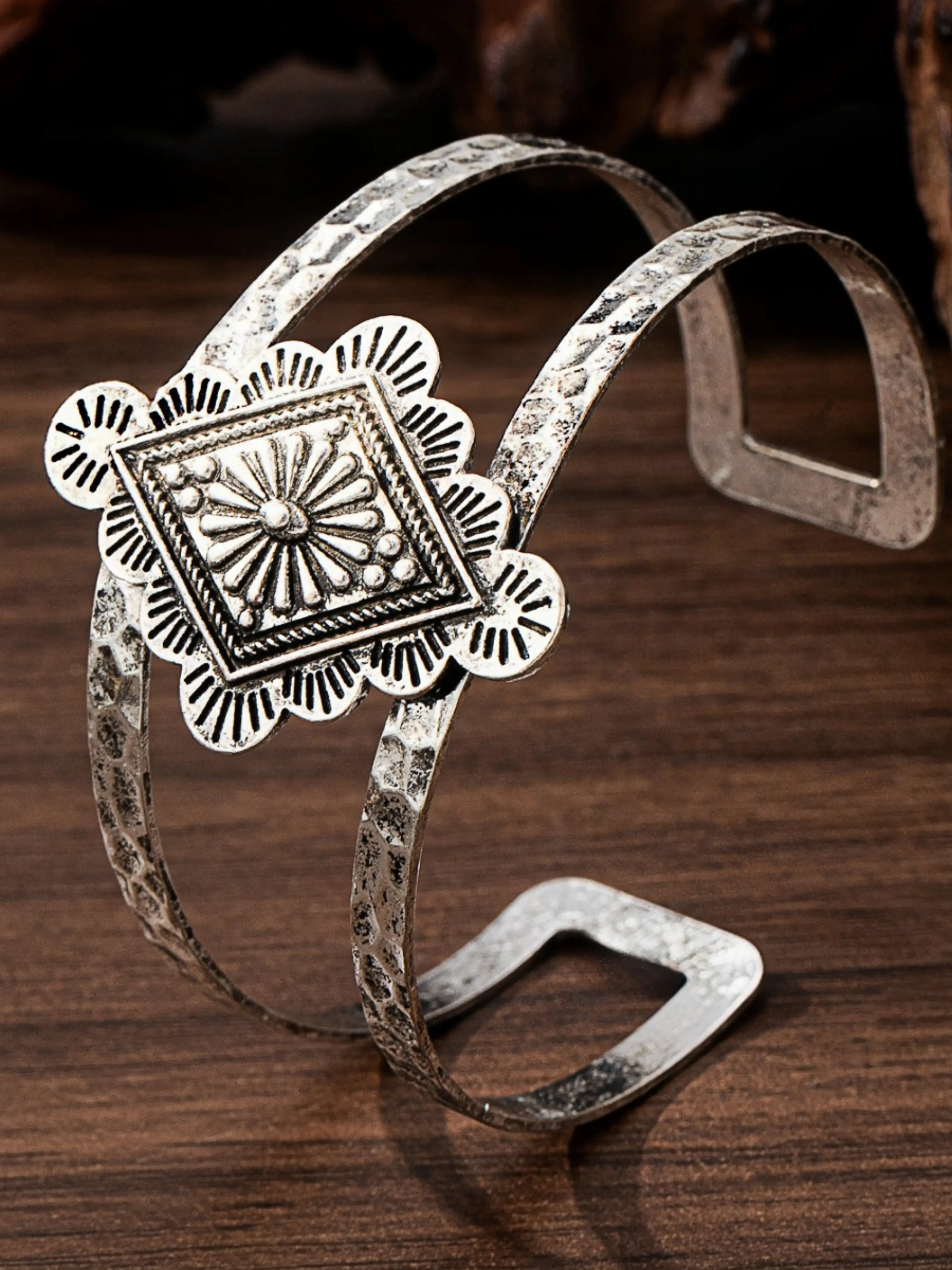 【Vintage Southwest Design】: Double-layer open cuff bracelet with hand-hammered texture and embossed geometric flower motif. Inspired by Native American and Western tribal style, creating a bold, bohemian statement look.