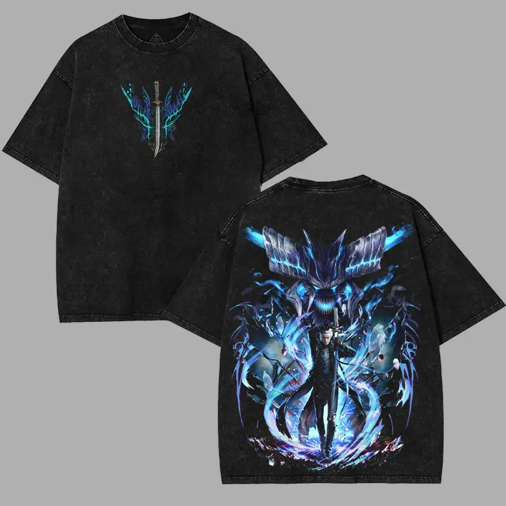 Devil May Cry Vergil the omega and alpha king son of sparda Anime Manga Clothes game Vintage Cotton 2 sided Washed Tshirt Top 90s graphic tees