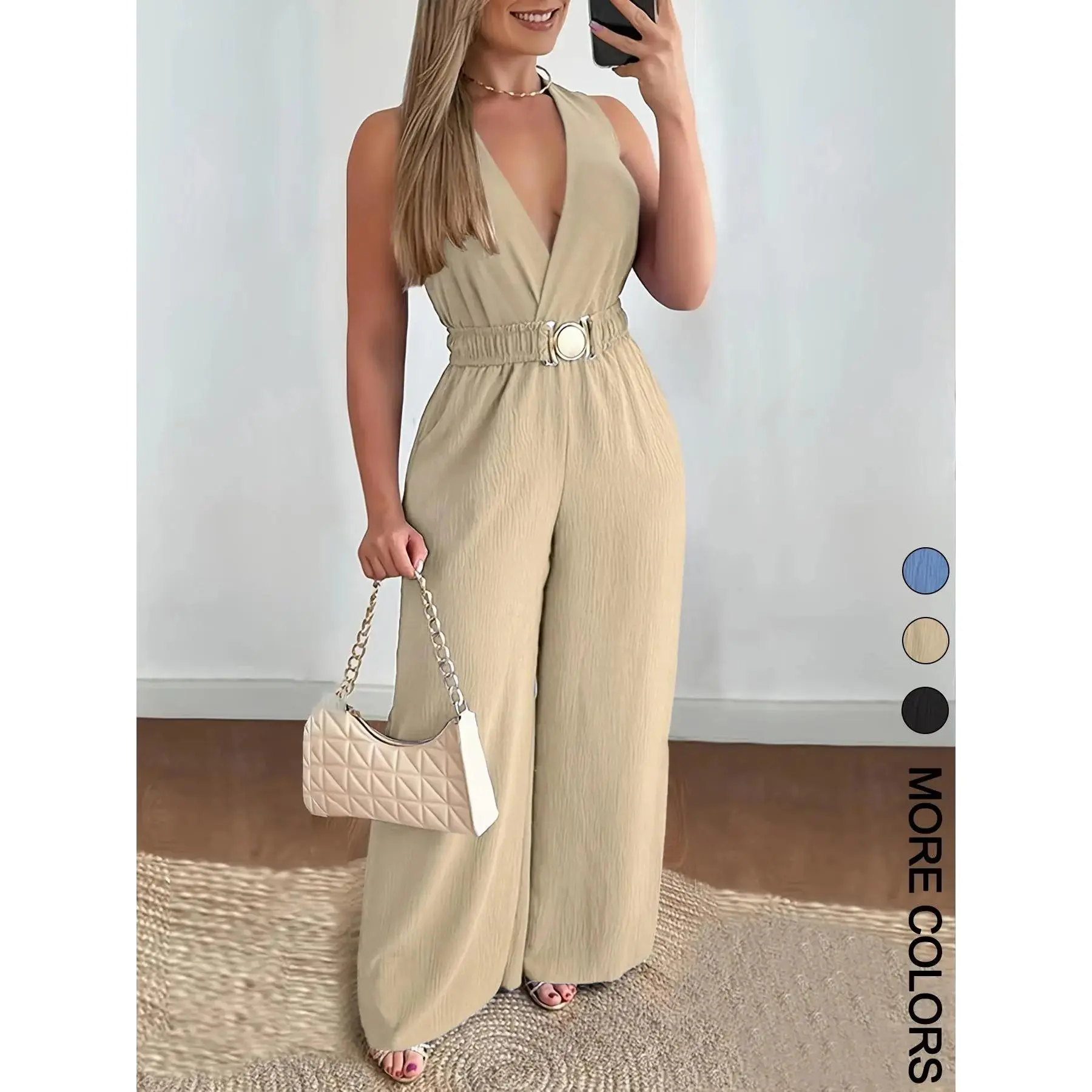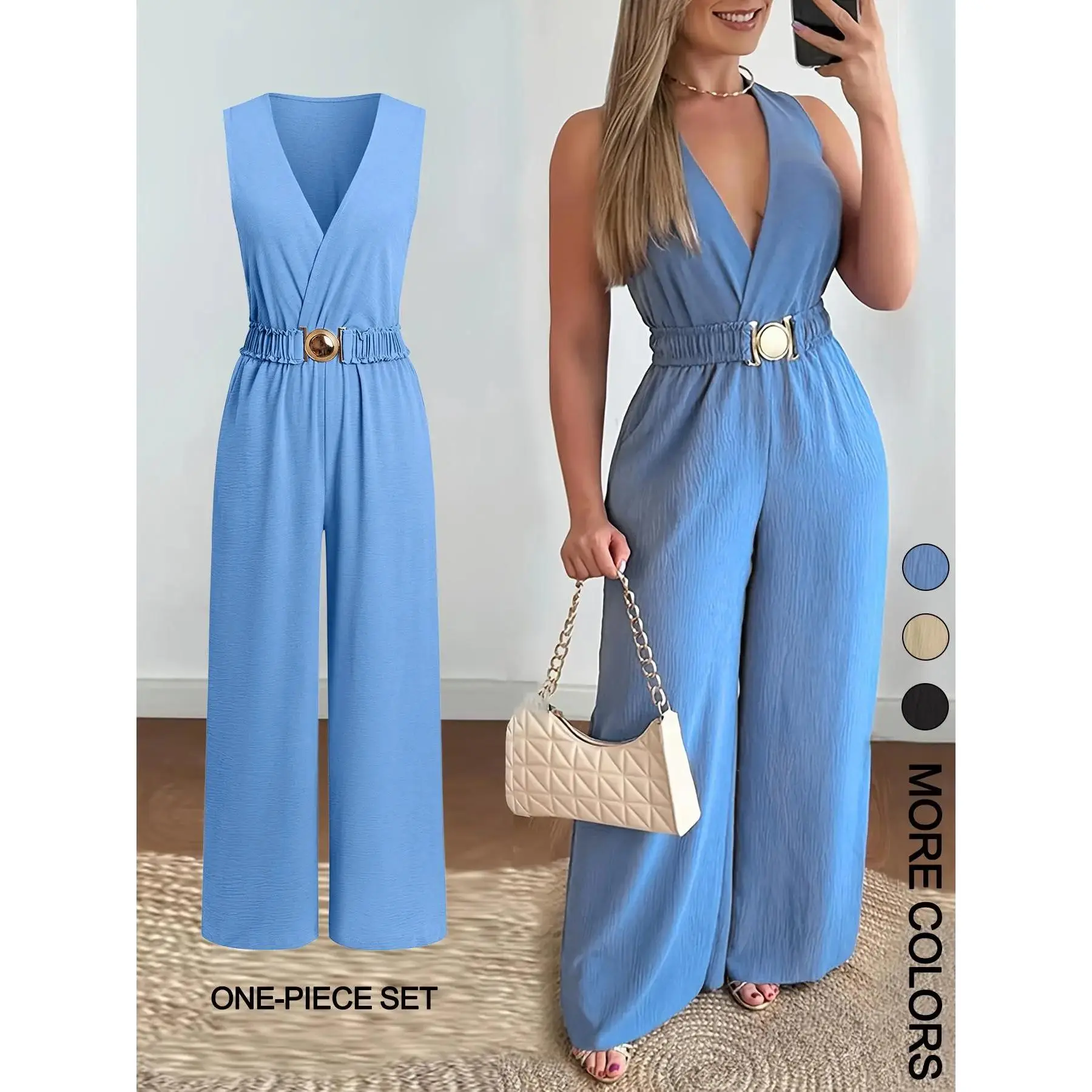 Women's Solid Belted Jumpsuit, Casual Sleeveless V Neck Jumpsuit for Summer, Women's Clothes for Daily Wear, Ruched Belted Jumpsuit