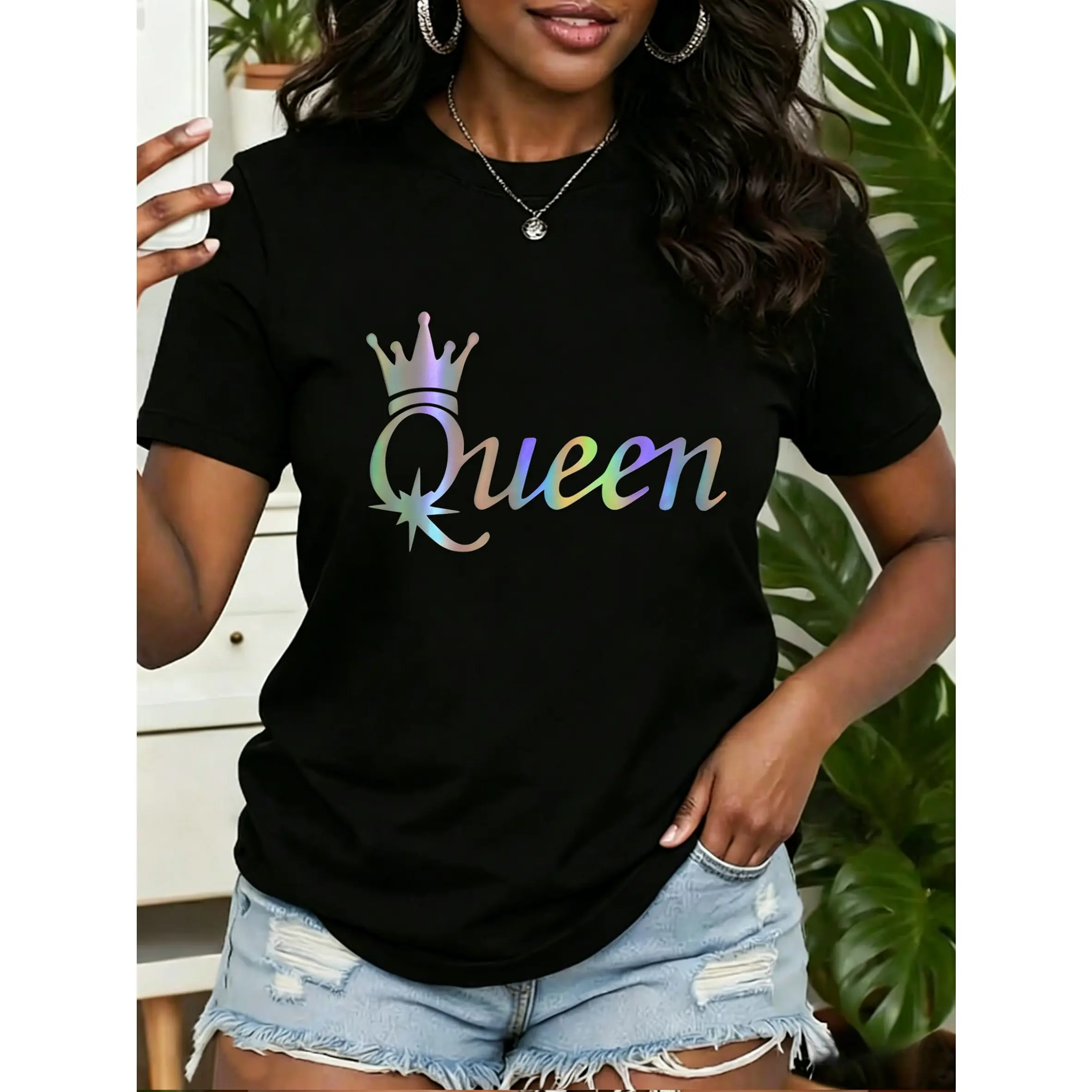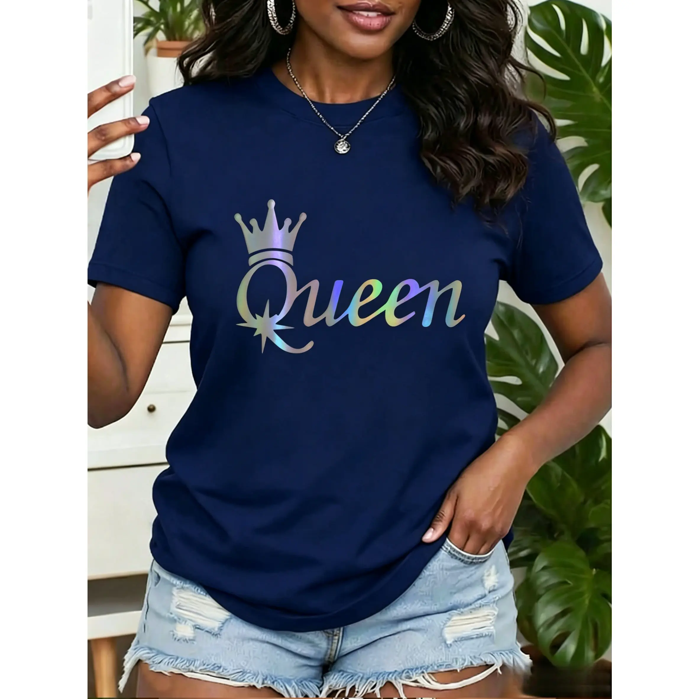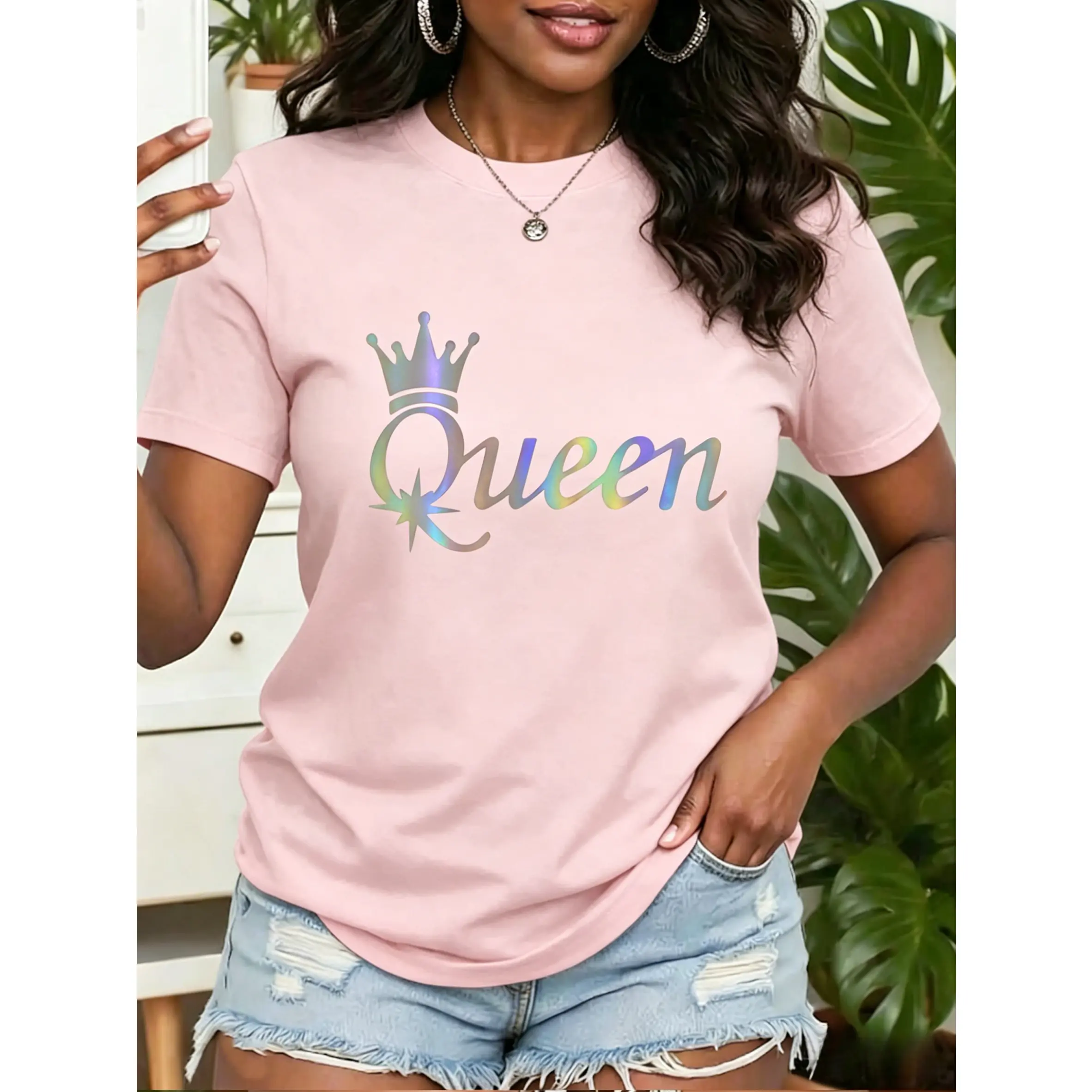 5. Women's short-sleeve top Queen Crown Queen print round neck, comfortable, soft, breathable, suitable for spring, summer, and autumn, versatile women's top