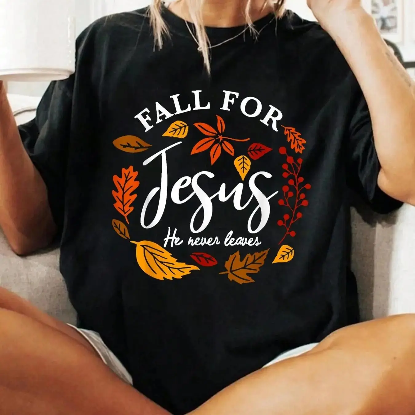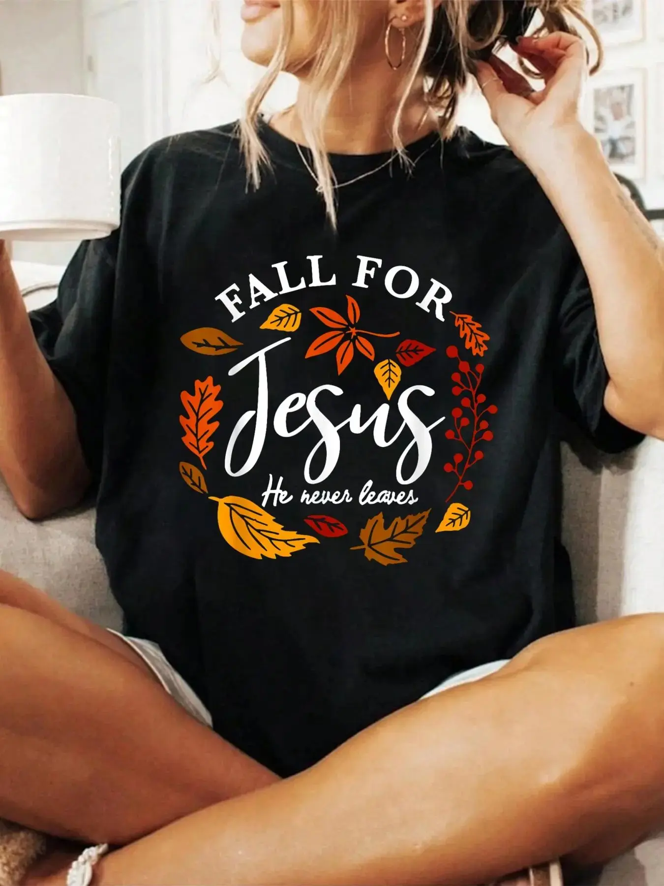 Fall For Jesus He Never Leaves Pumpkin Autumn Thanksgiving T-Shirt Print T-Shirt Casual Crew Neck Short Sleeve Comfort Tee Top For Spring & Summer Women's Clothing