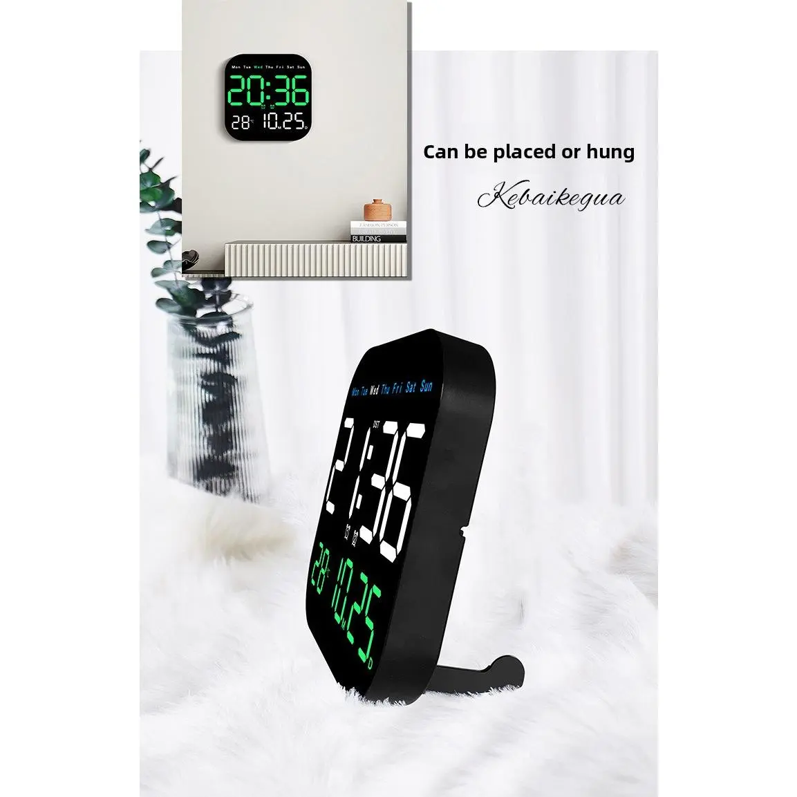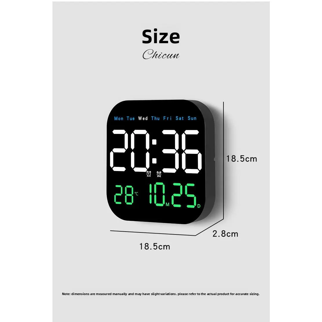 Elevate your home decor with this modern wall clock. It features a large display showing time, temperature, date, and weekday. Perfect for living rooms and bedrooms, it's battery-operated and easy to hang or place on a table. The clock includes an adjustable brightness setting and an alarm timer. Stay organized with its clear, digital readout.
