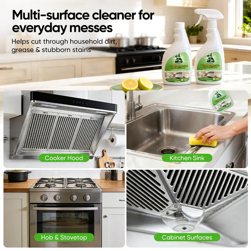 It helps soften and lift visible grease, grime and residue from a range of hard, non-porous kitchen surfaces, so daily cleaning feels quicker and easier.
