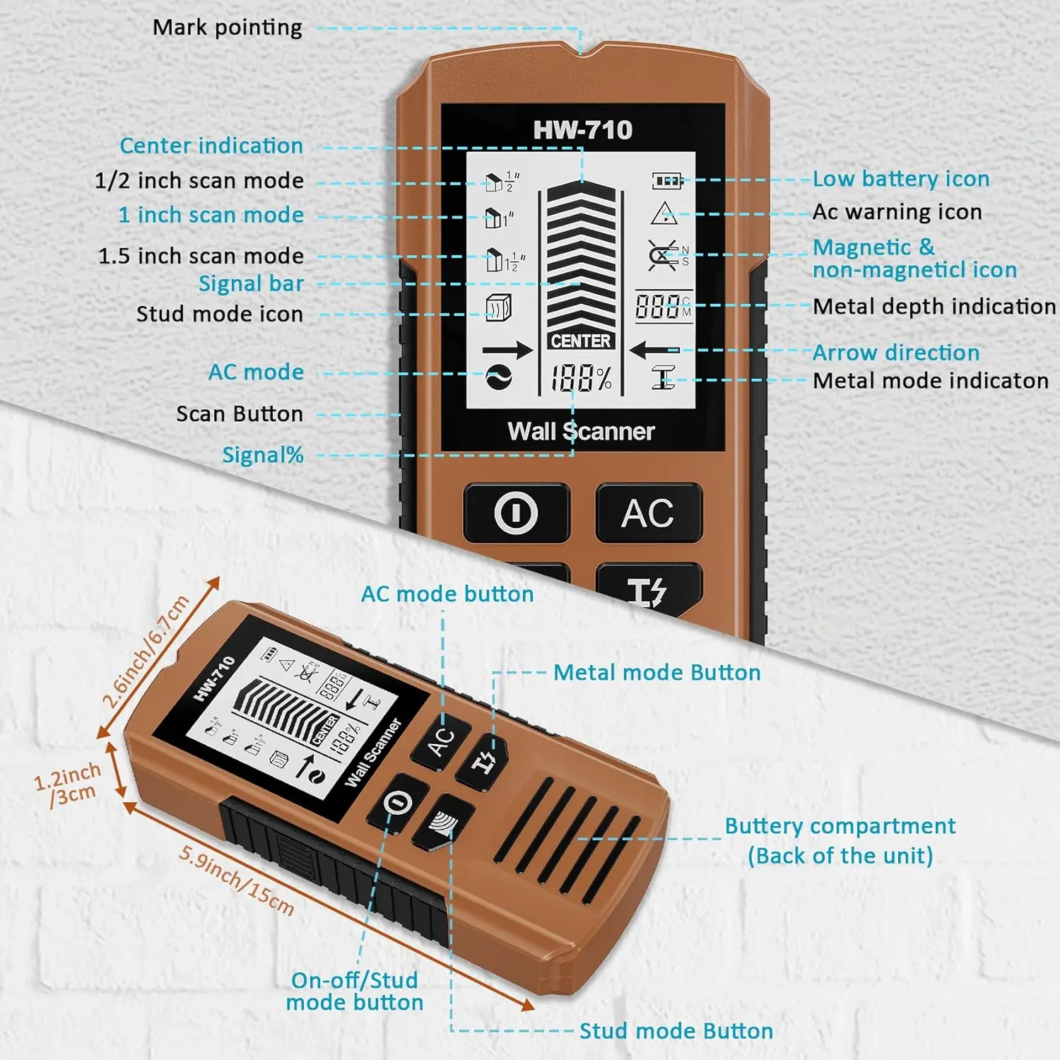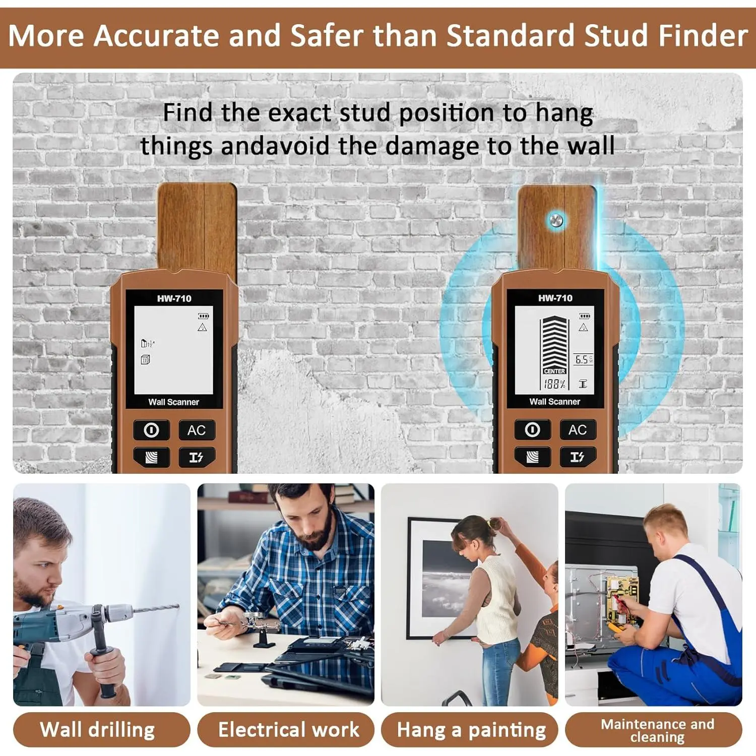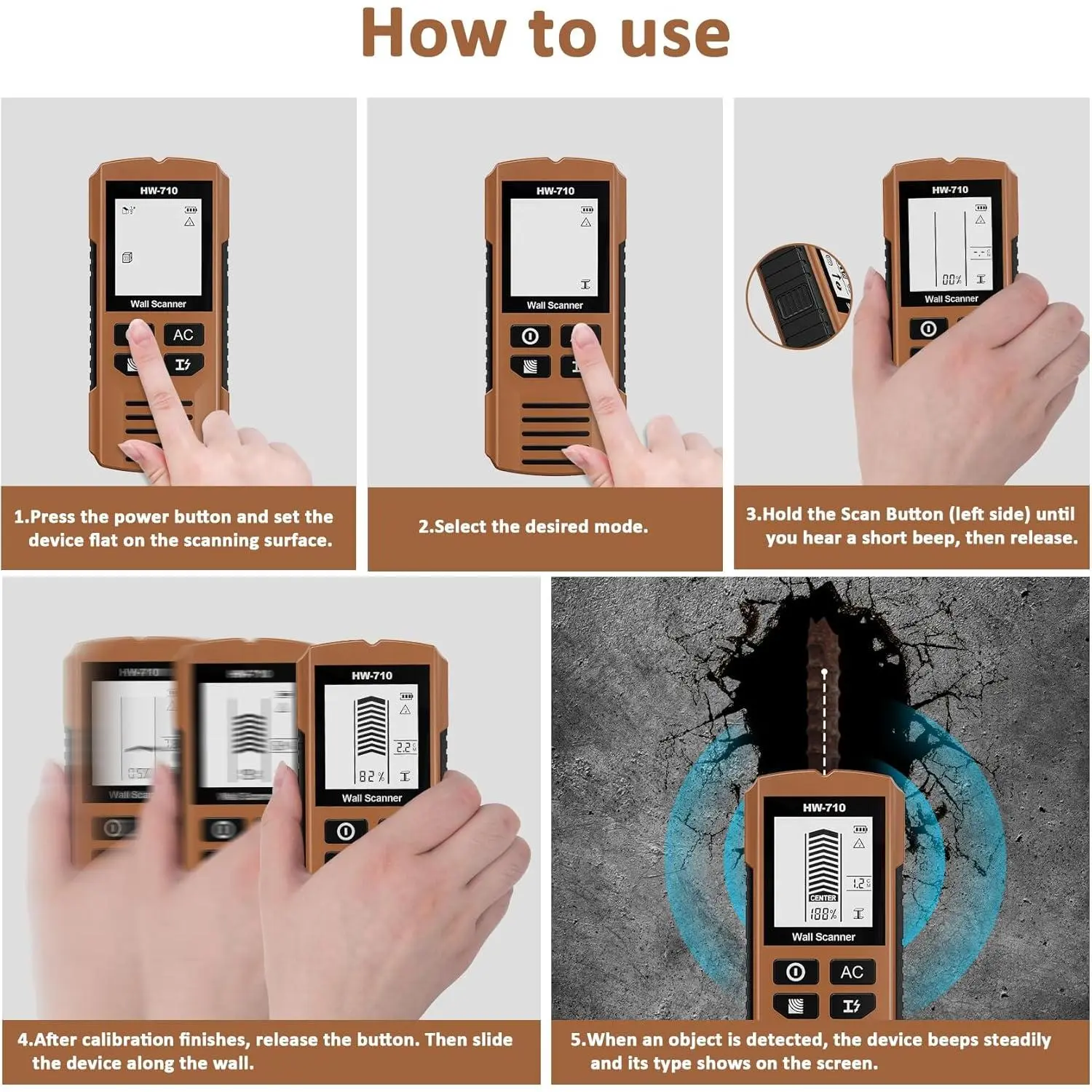 5-in-1 Multifunction Stud Detector: The upgraded 5-in-1 stud finder wall scanner meets diverse scanning needs.Choose from five stud detection depths in wall detector scanner: Stud Scan (0.5", 1", 1.5"), AC Scan (2"), and Metal Scan (2.36").Wall stud finder effortlessly detect wood studs, metal objects, joists, pipes, and live AC wires behind walls, floors, and ceilings.Rapid testing saves time and effort and makes tasks easier to complete.Precision & Sensitivity Wall Scanner: Equipped with an advanced intelligent microprocessor chip, this stud detector offers exceptional sensitivity.The stud finder wall scanner swiftly and accurately locates the center and edges of hidden objects, saving you significant time and effort on any project.Whether you're a professional contractor, homeowner, or DIY enthusiast, this stud and electrical finder wall scanner screw scanner proves invaluable for your tasks.HD Display & Audio Alerts: This stud locator as circuit breaker finder tool features a bright backlit LCD screen.Stud sensor provides intuitive visual indication of stud centers, edges, positions, and battery status.The wood stud finder, wire, and pipe detector utilizes clear audio tones – the beeping intensifies as you approach the target.This ensures precise detection even in low-light environments.User-Friendly Design: This wood detector for wall features dedicated buttons for each function and an ergonomic non-slip grip, delivering comfortable and effortless operation.For optimal accuracy, simply calibrate using the side button when switching modes to minimize errors and ensure reliable detection of objects behind walls.Stud detector is compact, lightweight design ensures easy portability, and the vibrant color allows for quick identification in your toolbox or workspace.Versatile Applications: This stud finder wall scanner quickly locates wooden studs, metal objects, and live AC wiring concealed within walls, floors, and ceilings. Wall detector scanner helps you avoid hazards when hanging items like TV brackets, picture frames, wall cabinets, garage shelving, tiered racks, bathroom fixtures, and other decorations. This makes it an indispensable tool for renovation projects, furniture installation, and home improvement tasks.