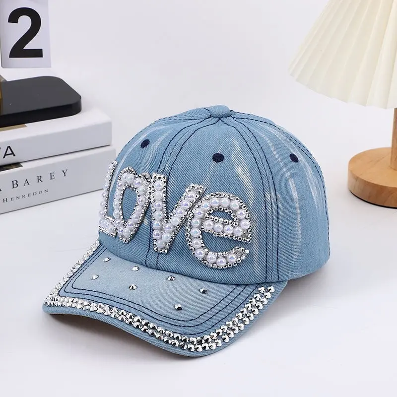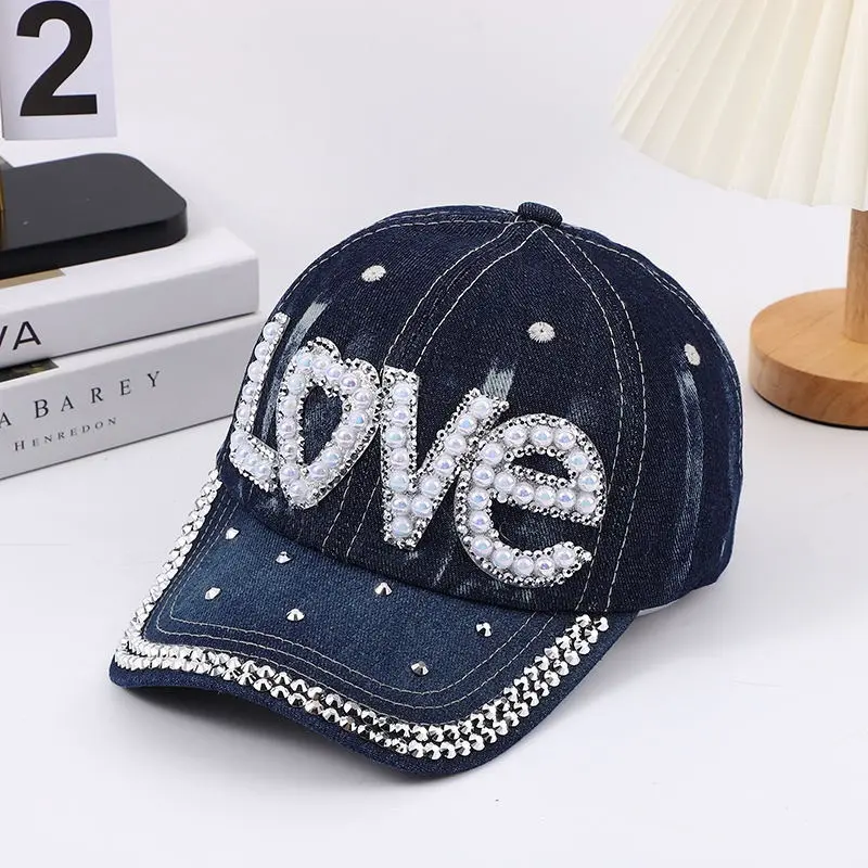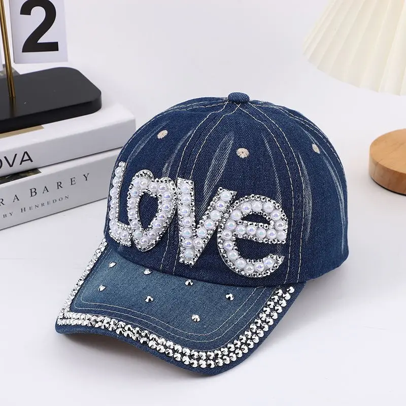 European and American handmade rhinestone-embellished sun protection hat, washed denim LOVE letter baseball cap for women, versatile sunshade from manufacturer