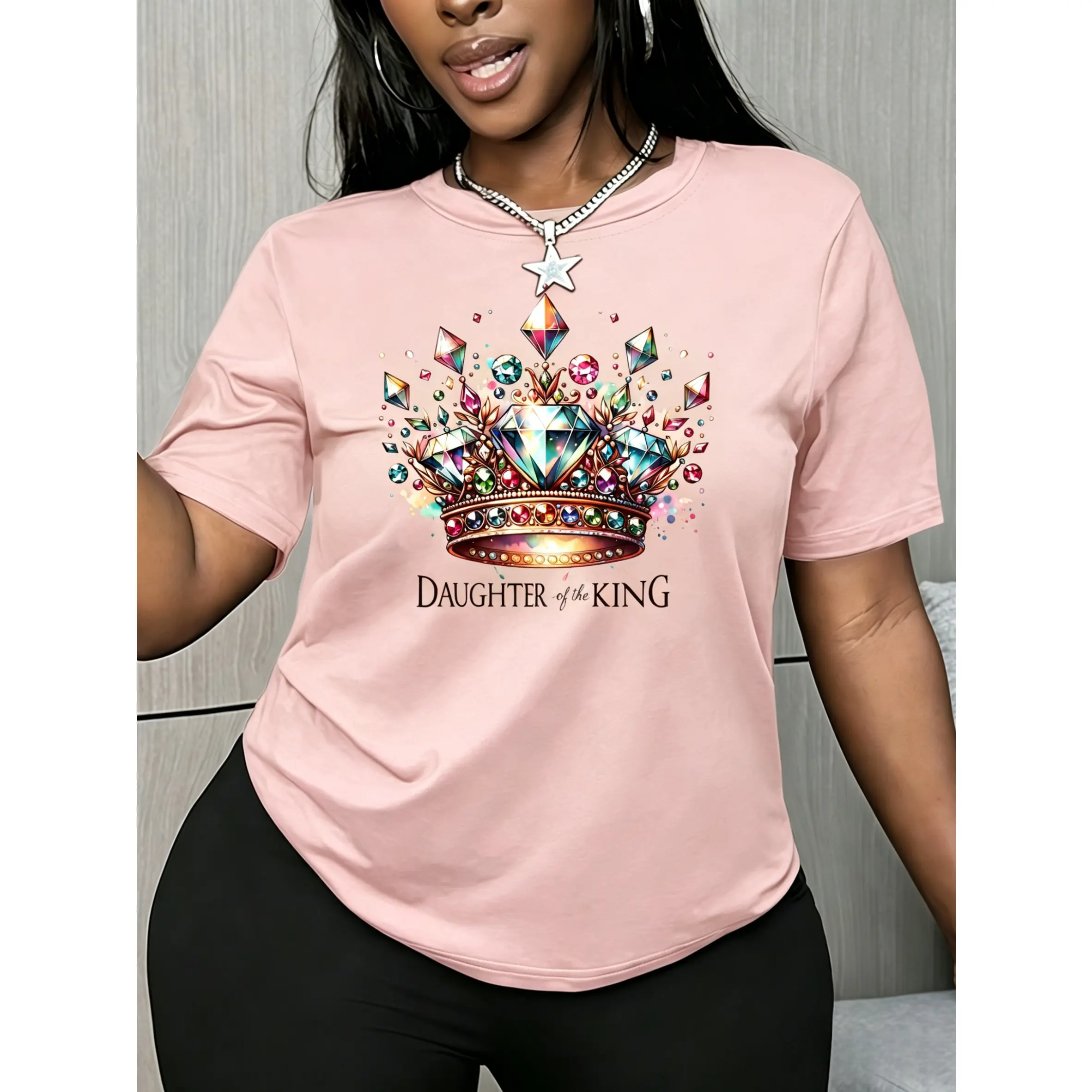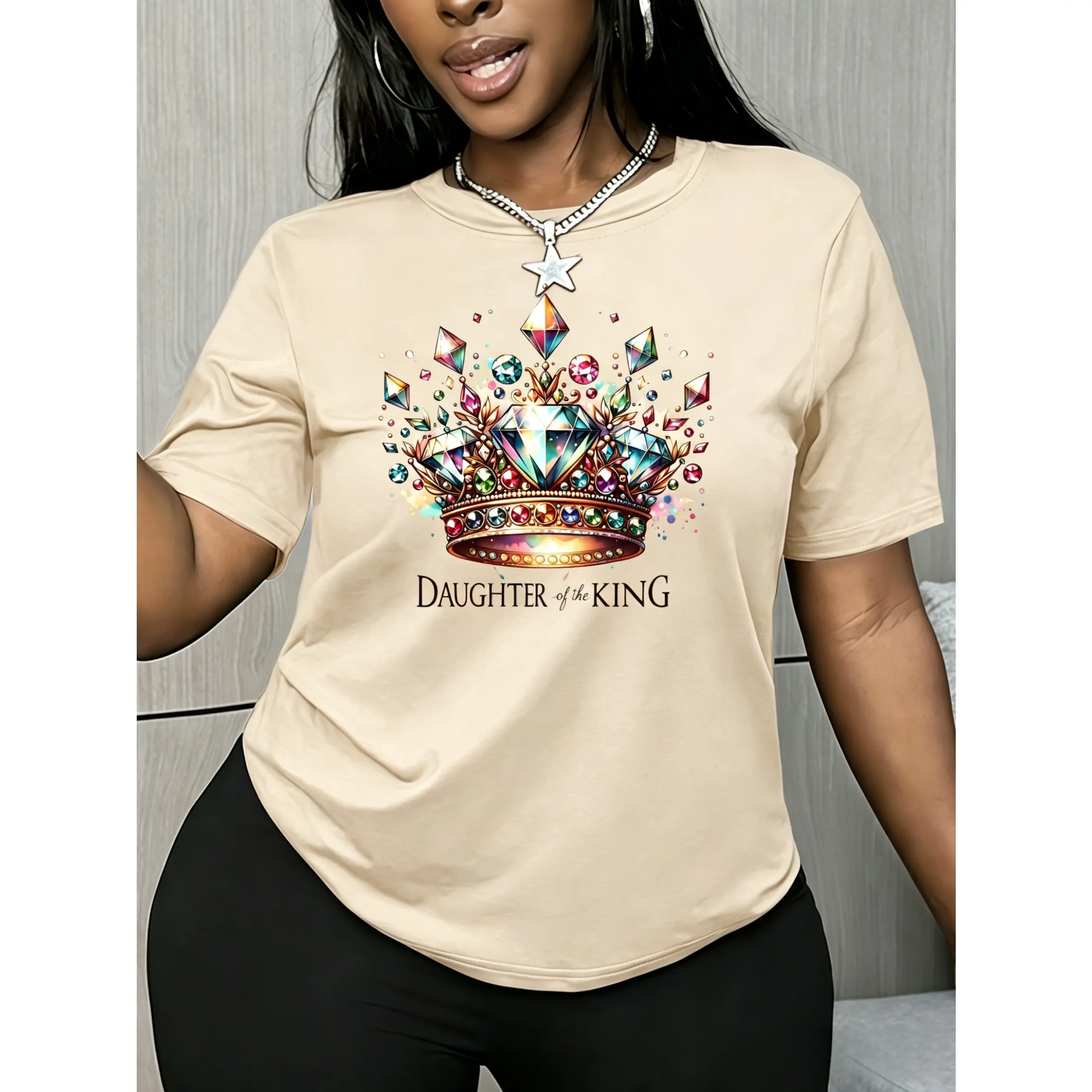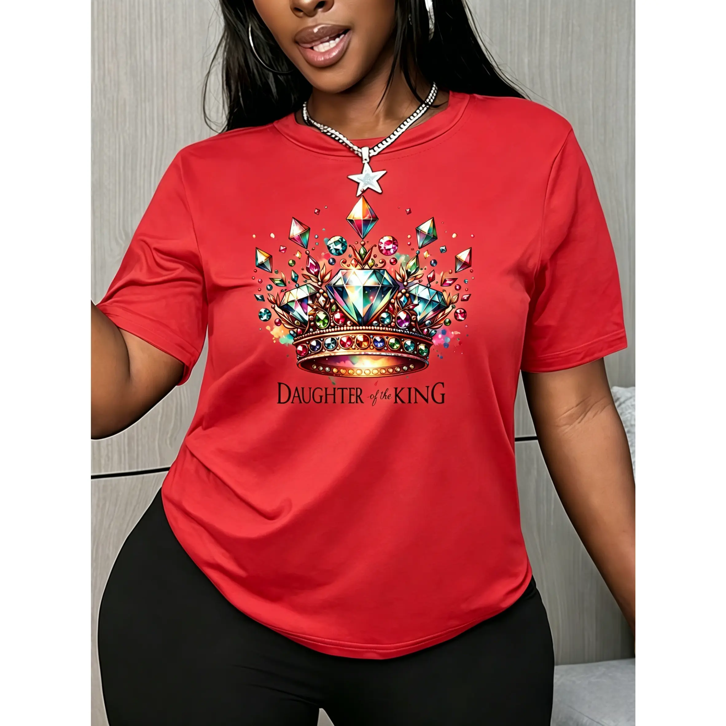 100% cotton, women's short-sleeve top DAUGHTER OF THE KING with colorful diamond crown print, comfortable, soft, breathable, suitable for spring, summer, and autumn, versatile women's top