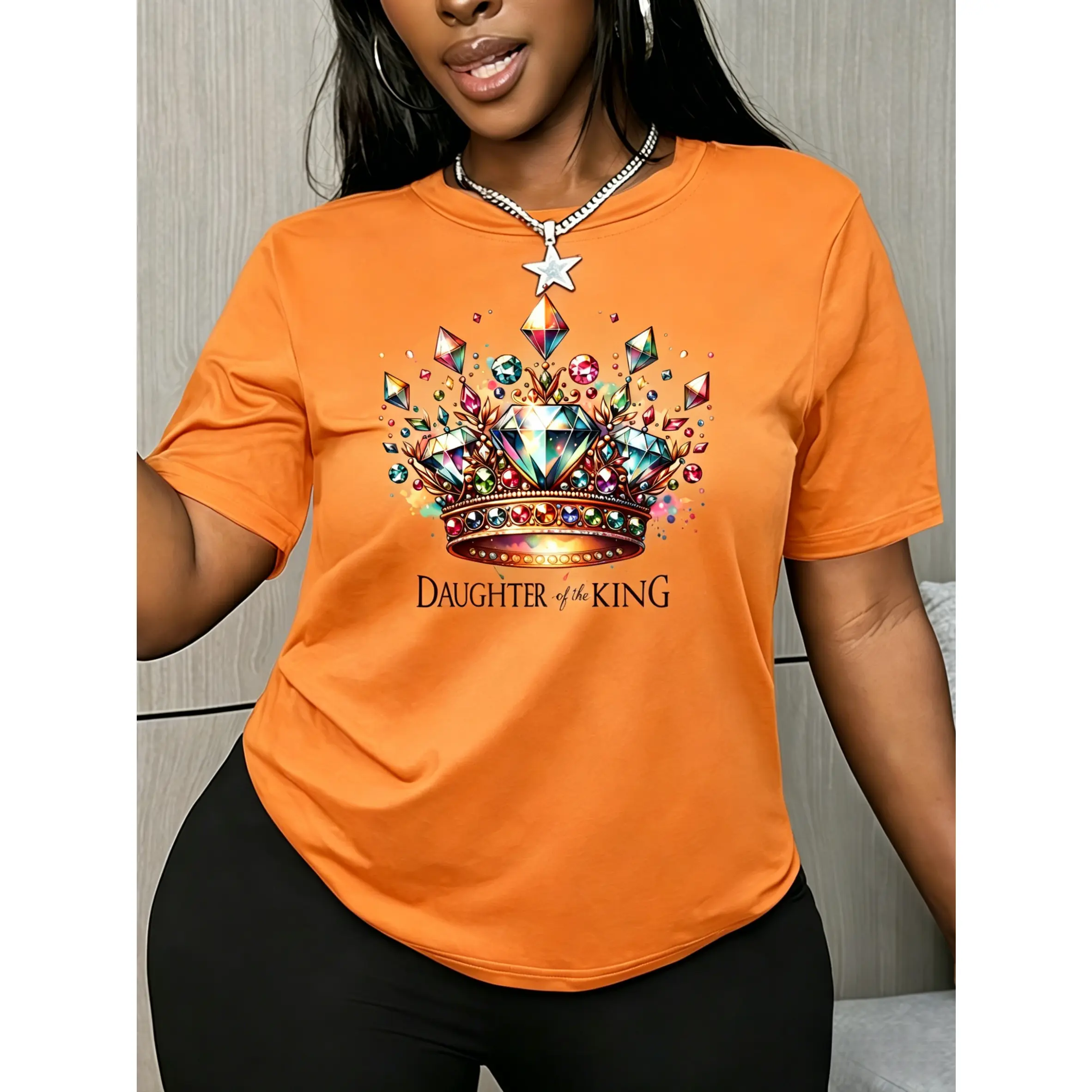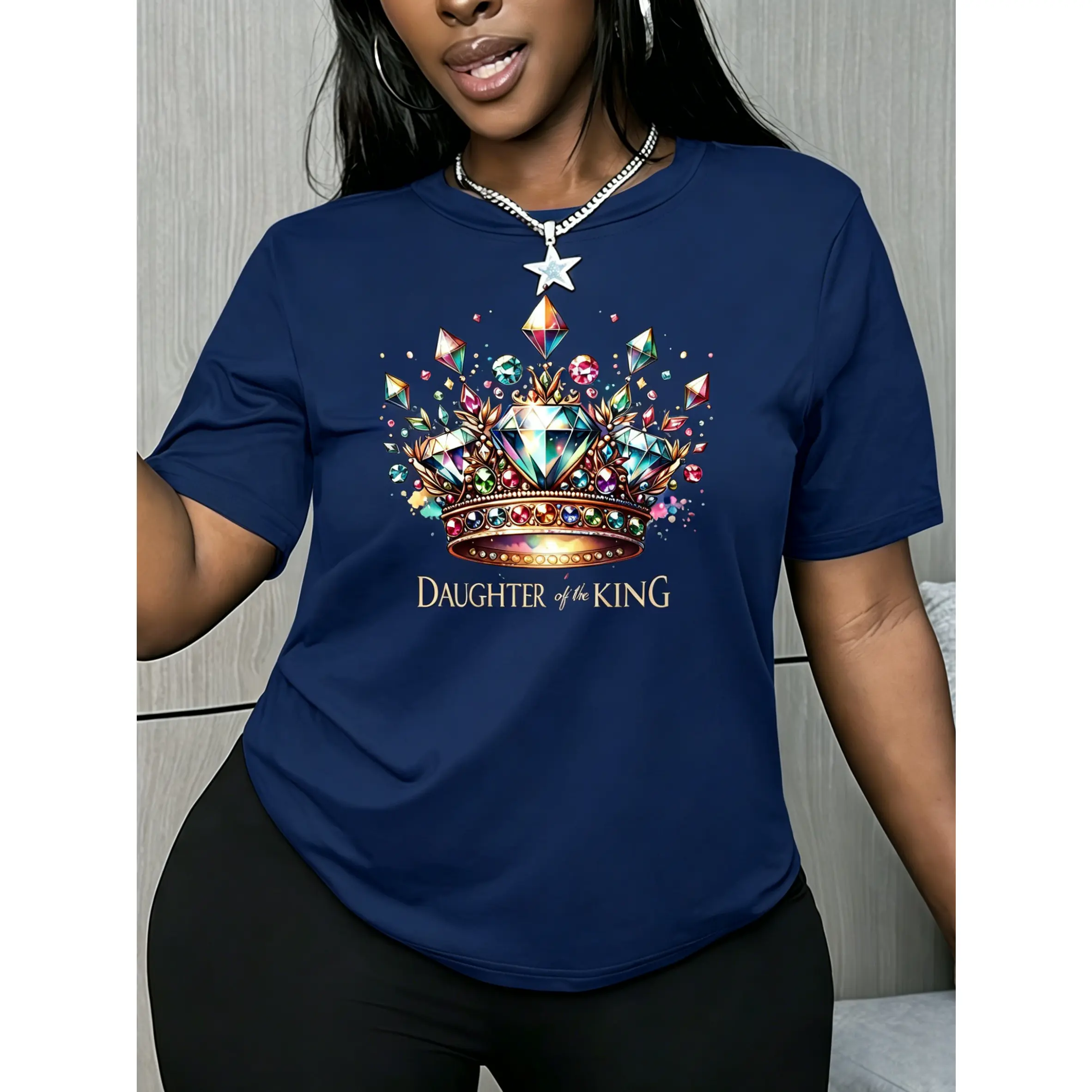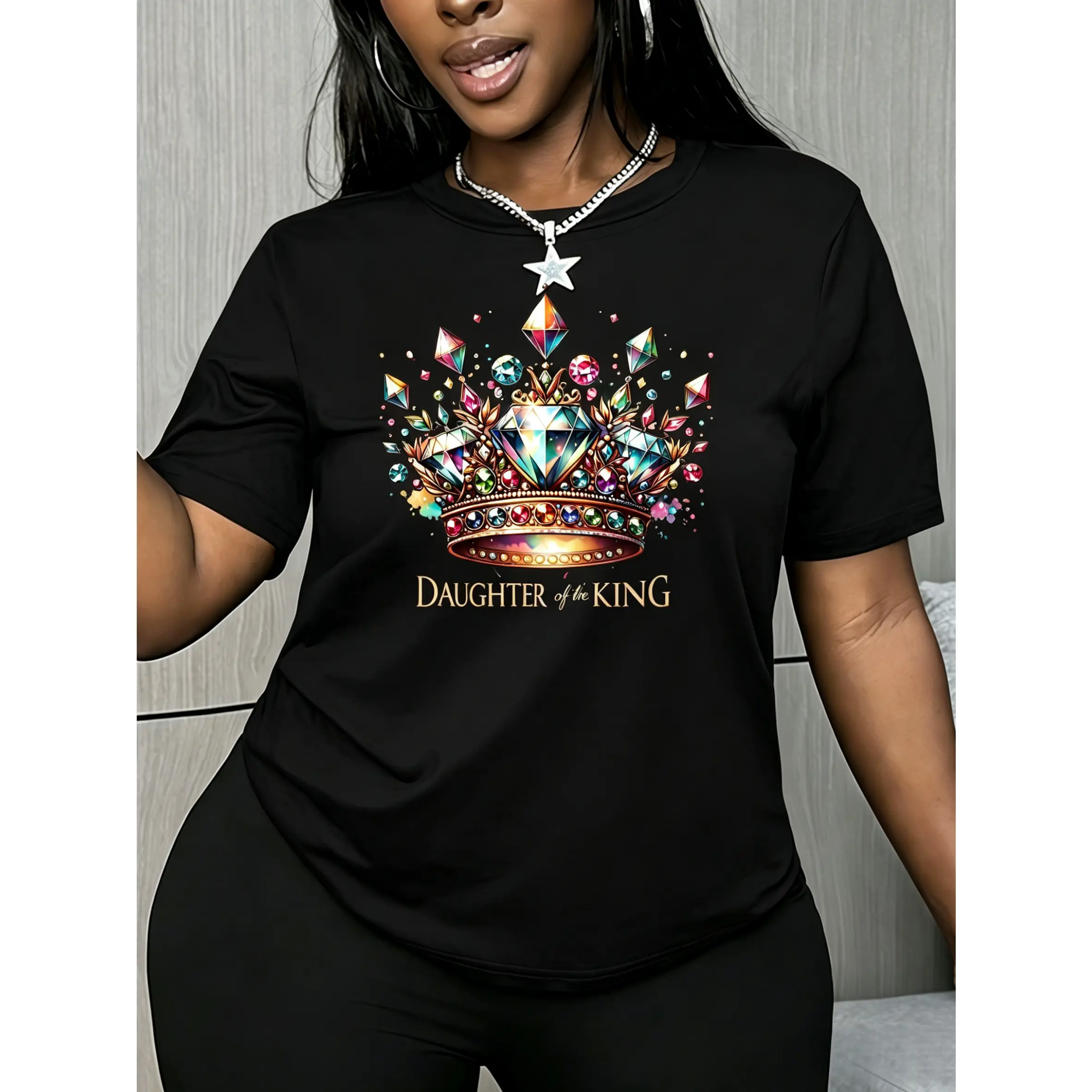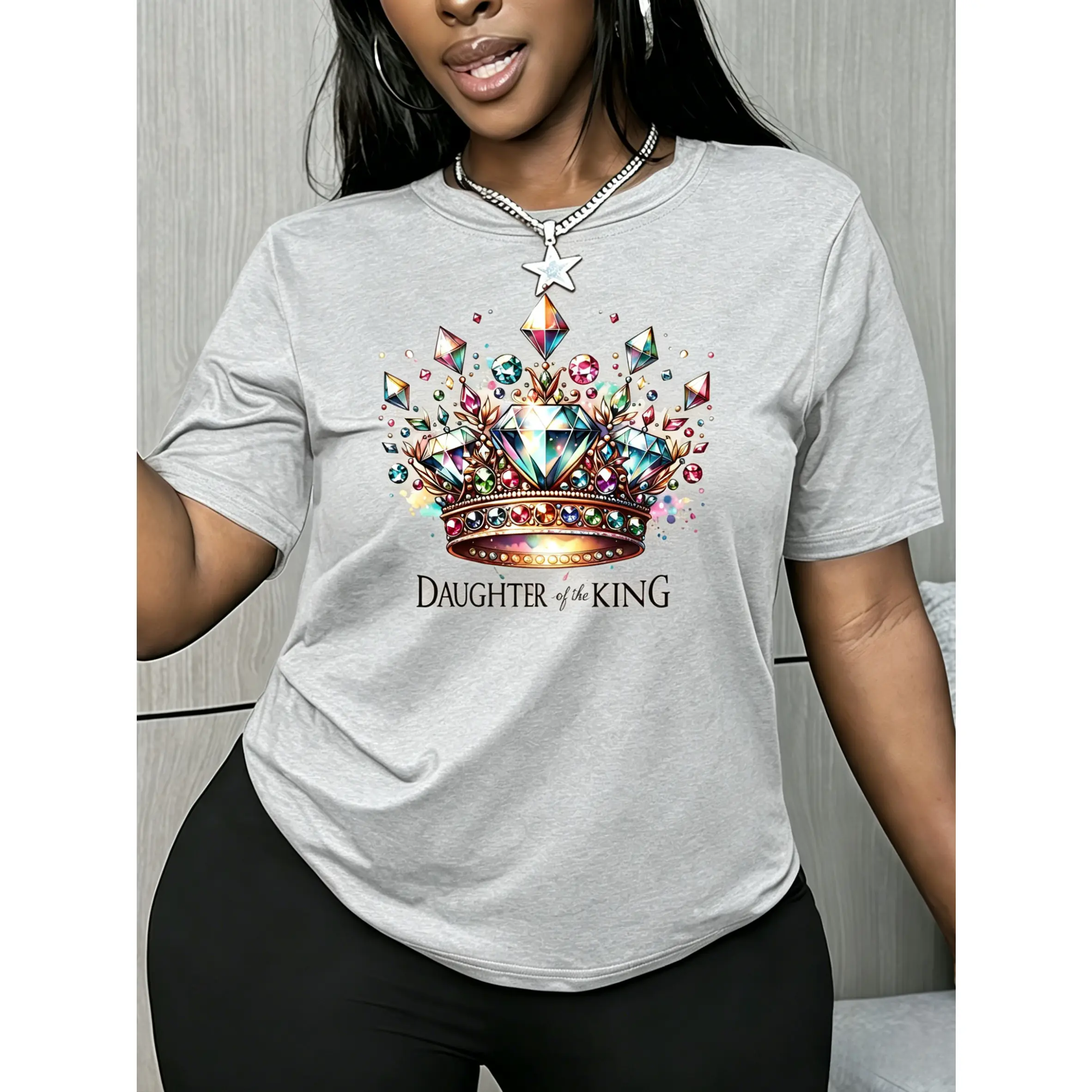 100% cotton, women's short-sleeve top DAUGHTER OF THE KING with colorful diamond crown print, comfortable, soft, breathable, suitable for spring, summer, and autumn, versatile women's top