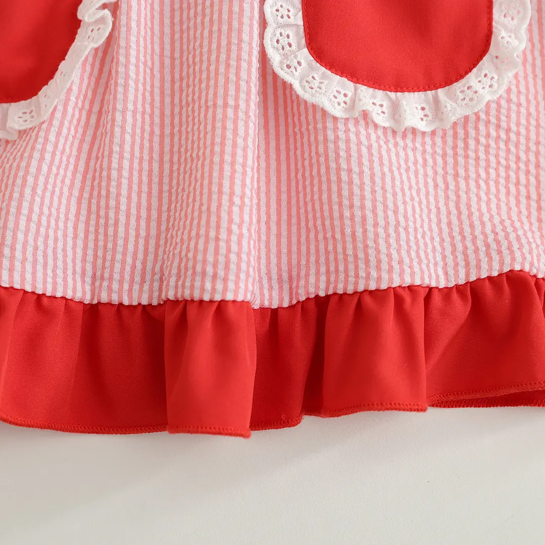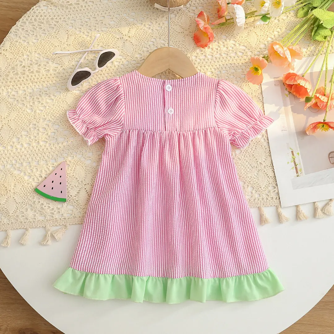 The dress boasts a striped pattern with short sleeves, ensuring your child stays cool. The ruffle detail adds a princess-like flair, making it a standout piece. The dress includes pockets, adding practicality to its cute design. Perfect for everyday wear or special occasions.