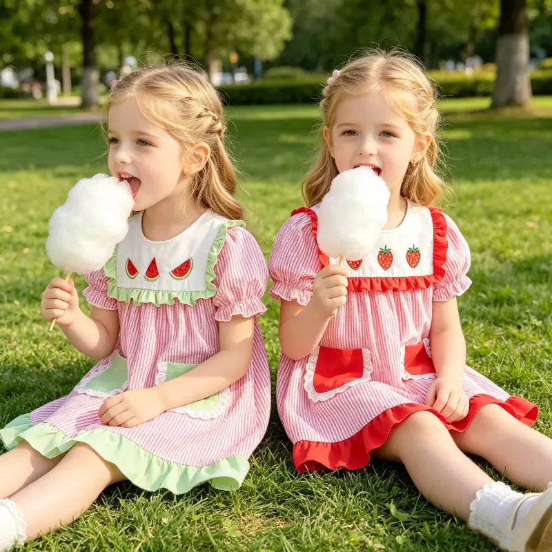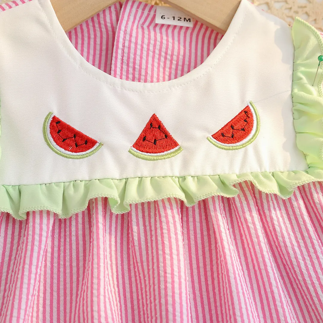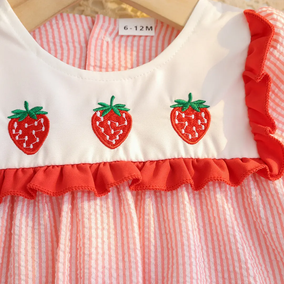 This adorable dress features charming strawberry and watermelon embroidery, perfect for your little one's summer wardrobe. The playful design adds a fun, festive touch to any outfit. Ideal for warm days, it keeps your toddler stylish and comfortable.
