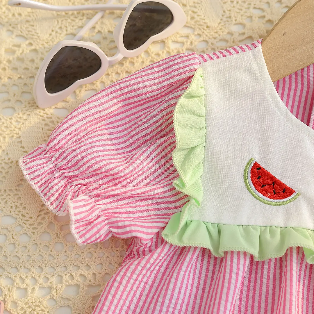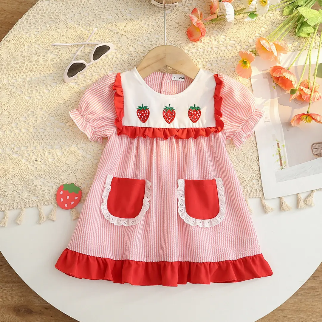 Toddler Girl Summer Outfit Strawberry/Watermelon Embroidery Striped Short Sleeve Ruffle Princess Dress with Pockets