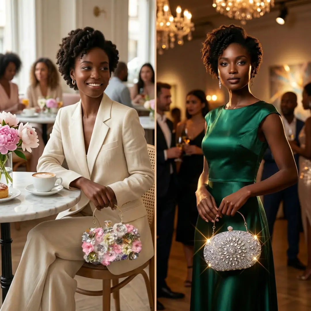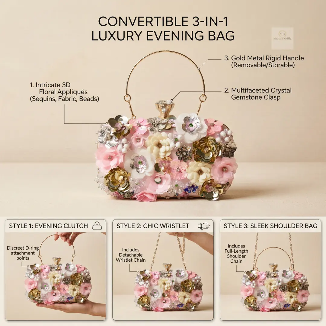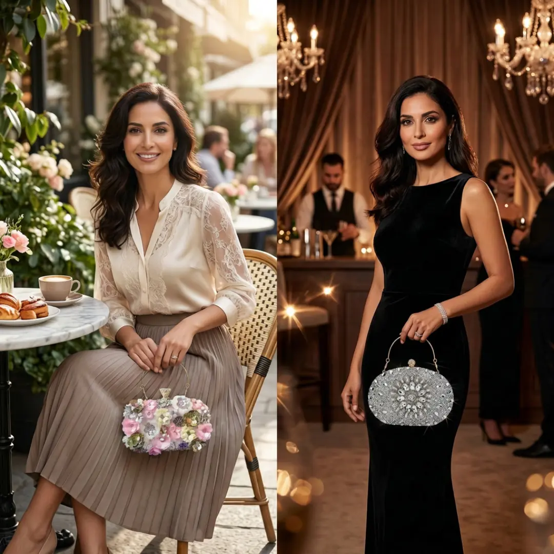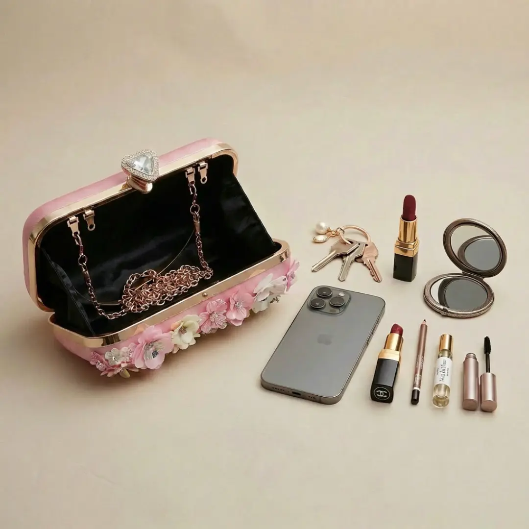 ·Pink Floral Bag (Daytime Elegance) Soft, feminine, and romantic. Perfect for brunch, Eid gatherings, shopping days, and daytime events where you want to look polished without trying too hard.