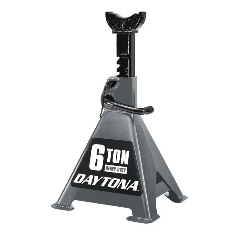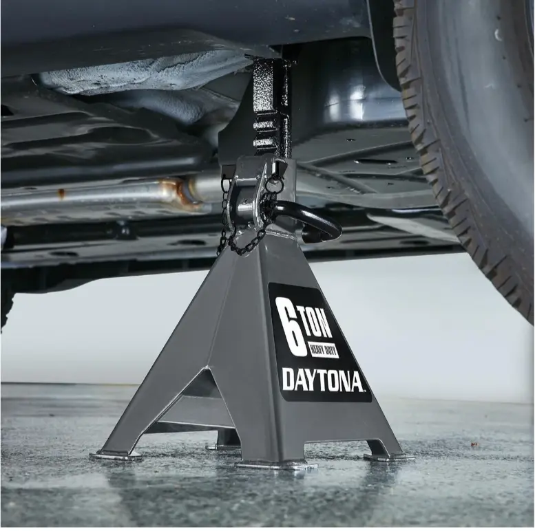 The DAYTONA Heavy Duty Jack Stands safely support up to 12,000 lb., offering stable, dependable protection. They are constructed with heavy duty, solid steel body panels and welded-in reinforcement braces for added strength and durability. These jack stands feature an easy-to-use ratcheting system to make quick height adjustments and double-locking mobility pins for extra safety and security.