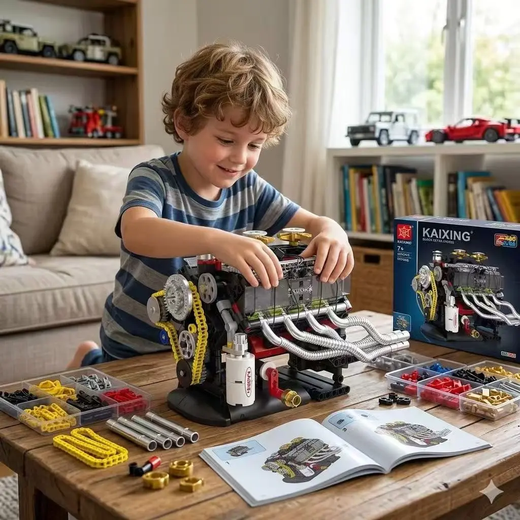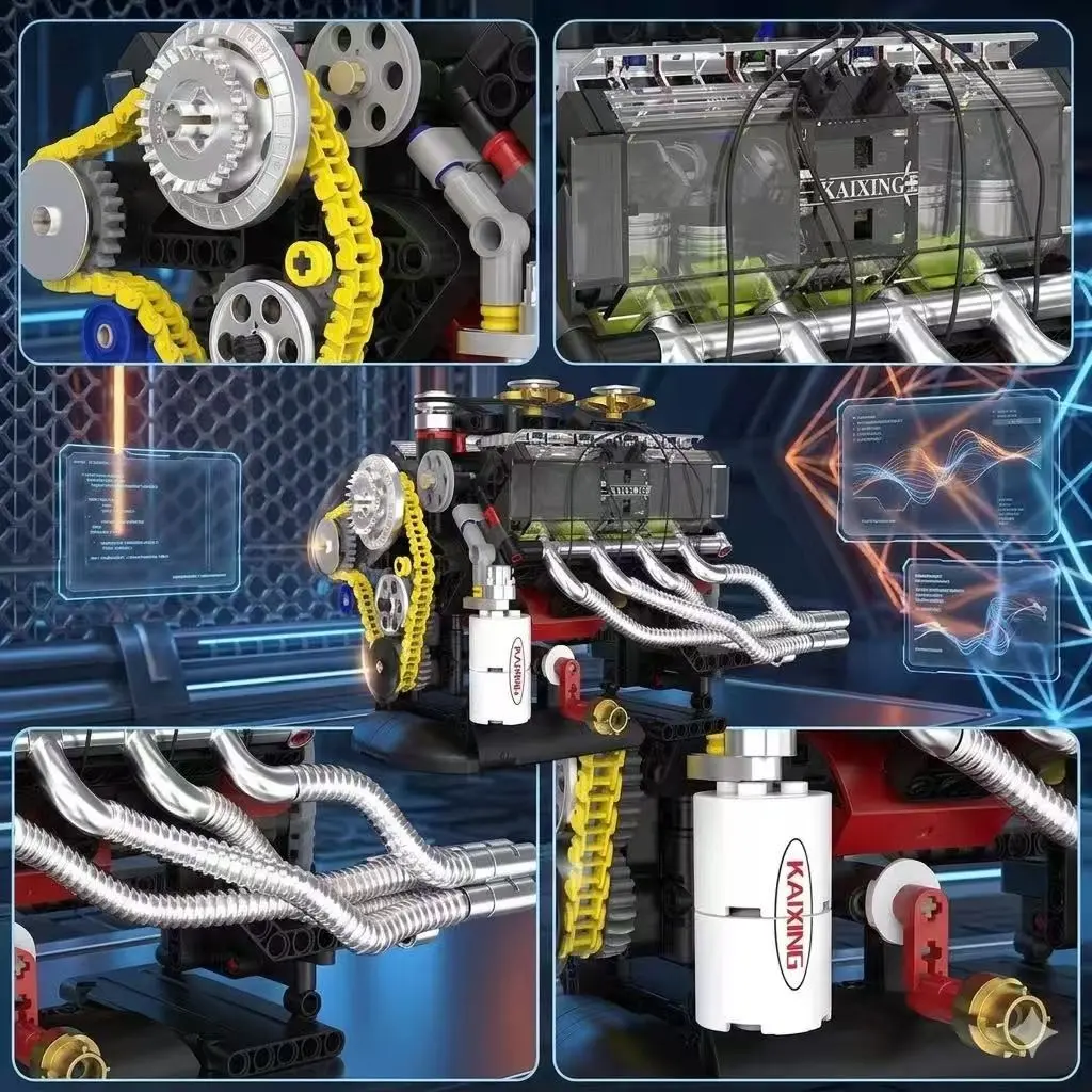 Shelby V8 Engine Building Block Set 659+ Pcs, Manual Starter, Mechanical Chain Drive, Transparent Cylinder Head, Perfect Christmas Birthday Gift