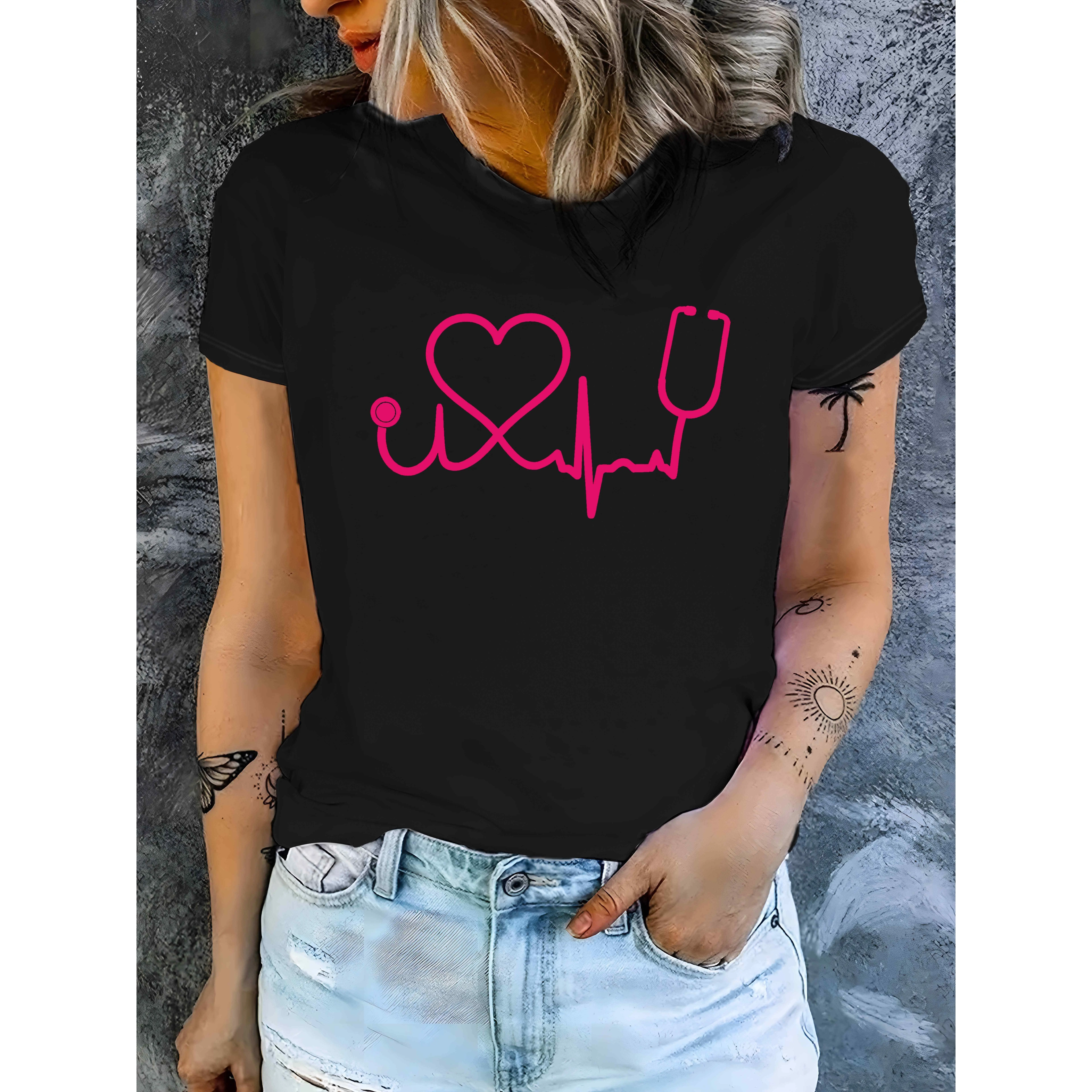 Women's Casual Nurse-Themed T-Shirt with Heart and Stethoscope Print, Soft Polyester Blend, Machine Washable - Perfect for Medical Professionals.