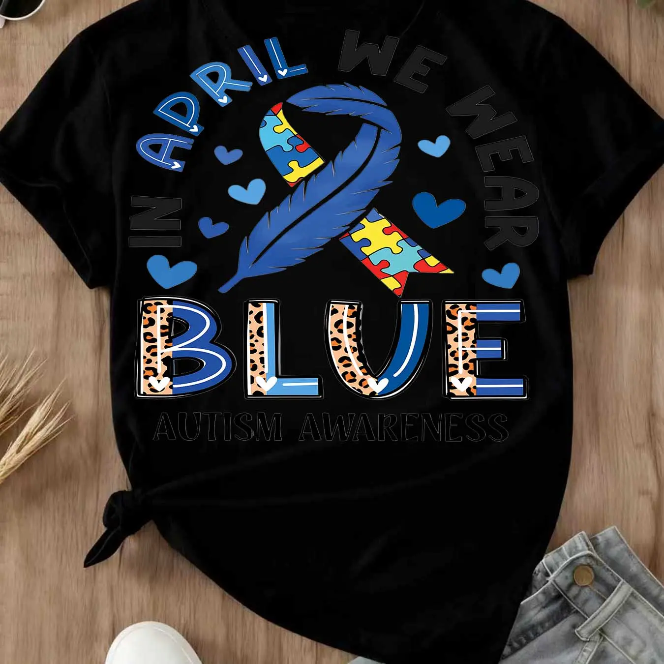 In April We Wear Blue Autism Awareness Ribbon And Puzzle Piece Print T Shirt Casual Round Neck Short Sleeve For Women Autism Awareness Month