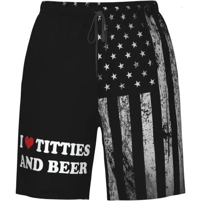 5. I-Heart-love-Titties-and-Beer Gag-Swimming Trunks, Quick Dry Beach Shorts Funny Men'S Swimwear Trunks for Men and