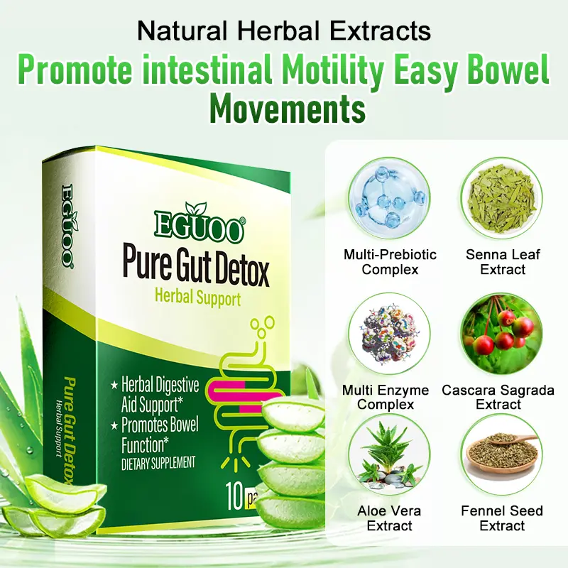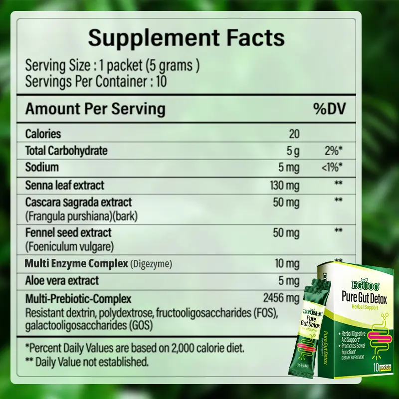 EGUOO Herbal Digestive Healthcare is a wellness supplement designed to improve digestive health and support nutrient absorption. Each packet contains a blend of senna leaf and Cascara sagrada, known for their digestive benefits, making it ideal for a one-day gut cleanse.