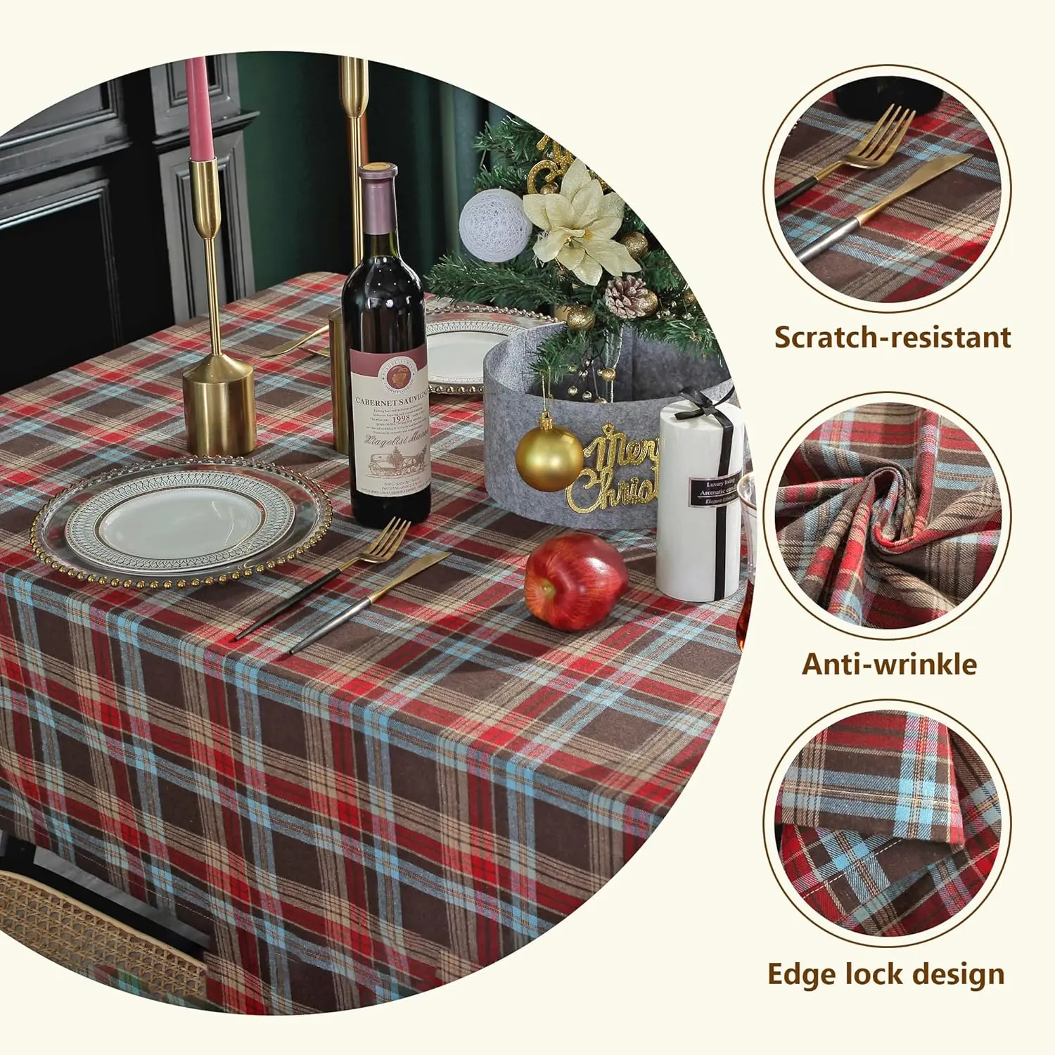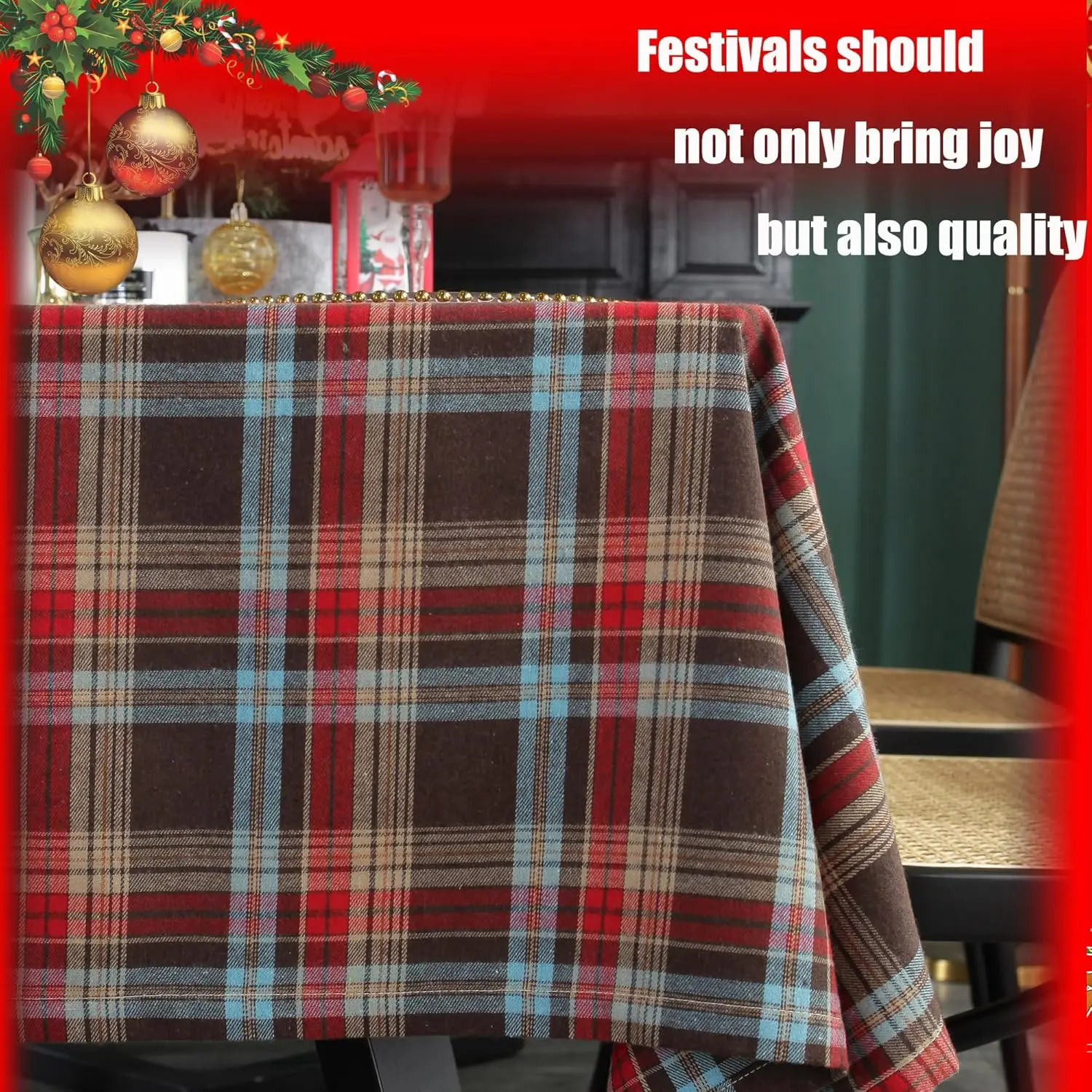·Plaid tablecloth Design: Birthday tablecloth features a classic plaid pattern of red, brown, and blue, with naturally draped edges and clean, regular check lines.Outdoor tablecloth embodies a retro British style.