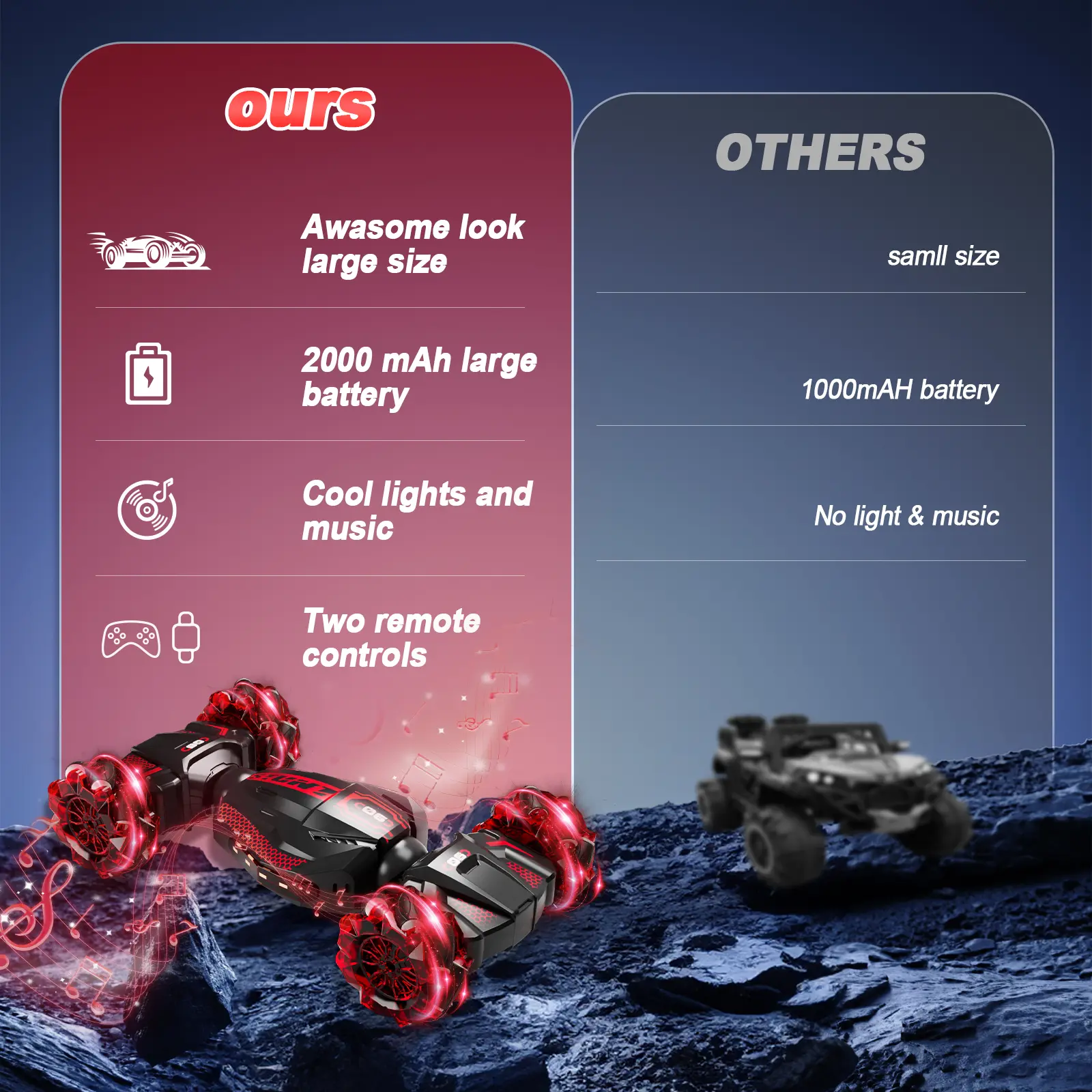 I was totally impressed when using it outdoors! The powerful rear-wheel drive handles small hills with ease, and the shock-resistant tires ensure smooth performance even on gravel roads. Perfect for outdoor adventures.