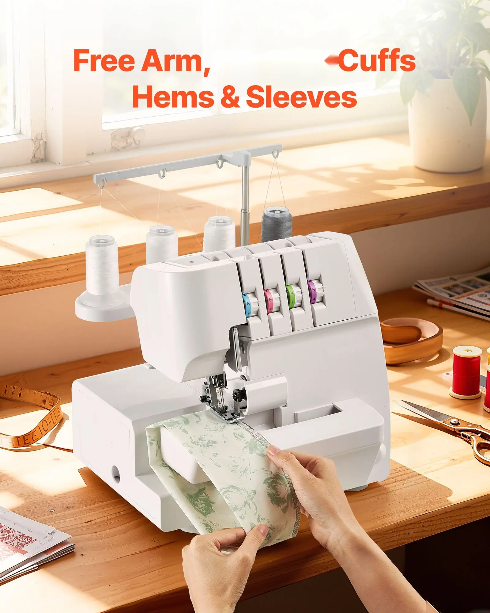 ·User-Friendly Design: The color-coded threading of the serger machine simplifies setup. The free arm works well for sleeves and cuffs. The LED lighting and adjustable presser foot ensure clear visibility and steady control on various fabrics