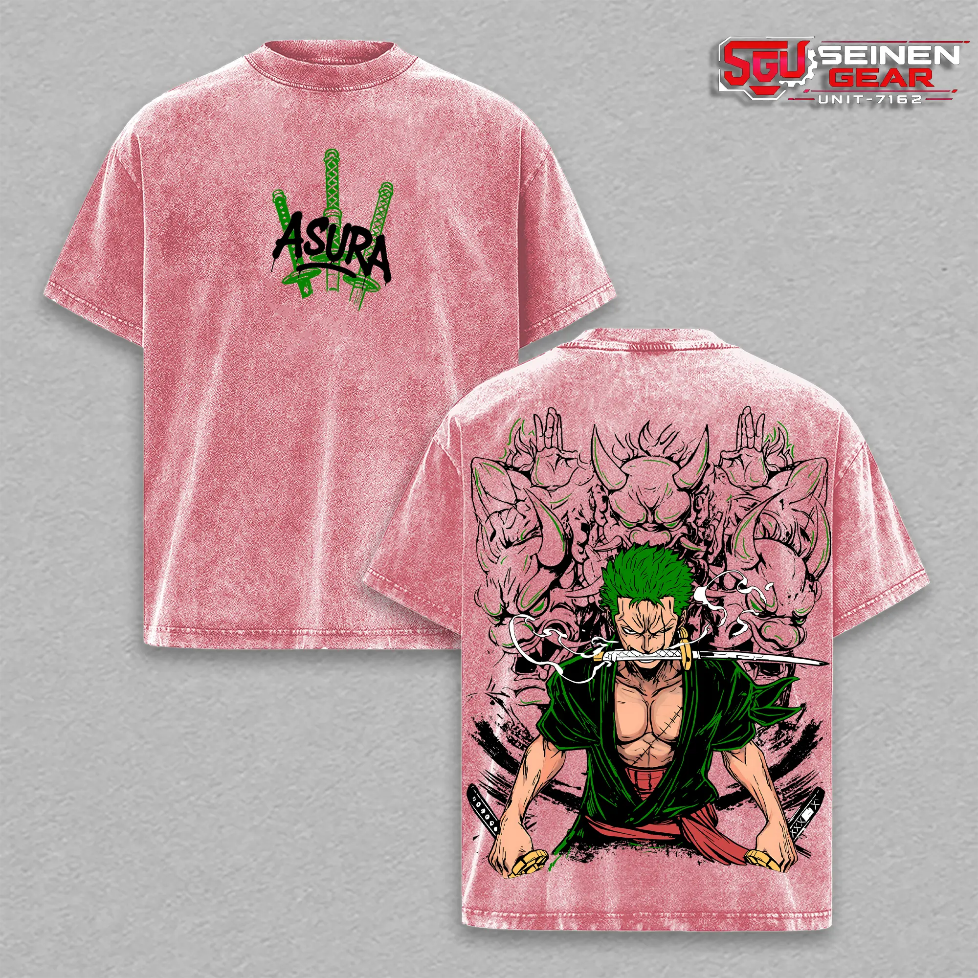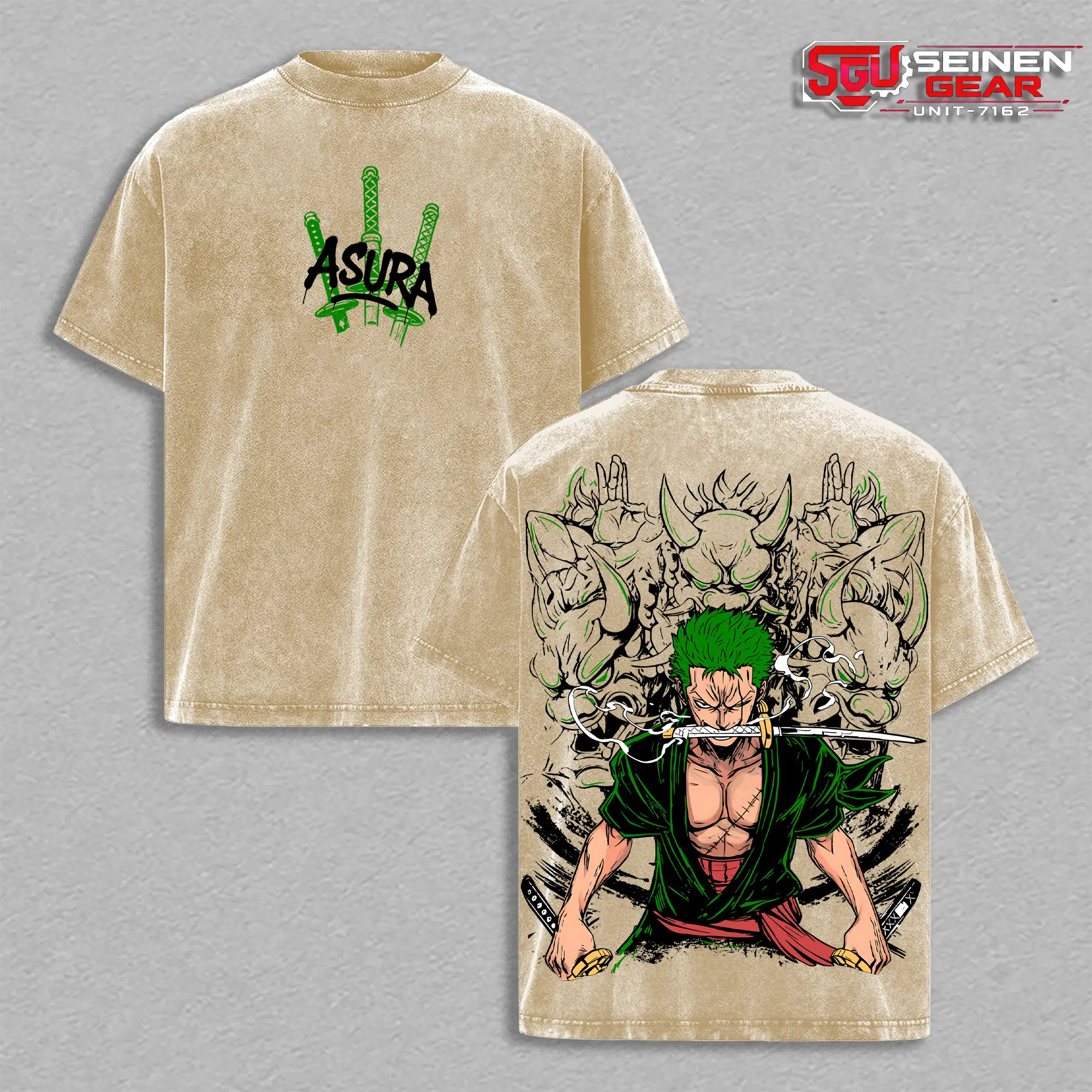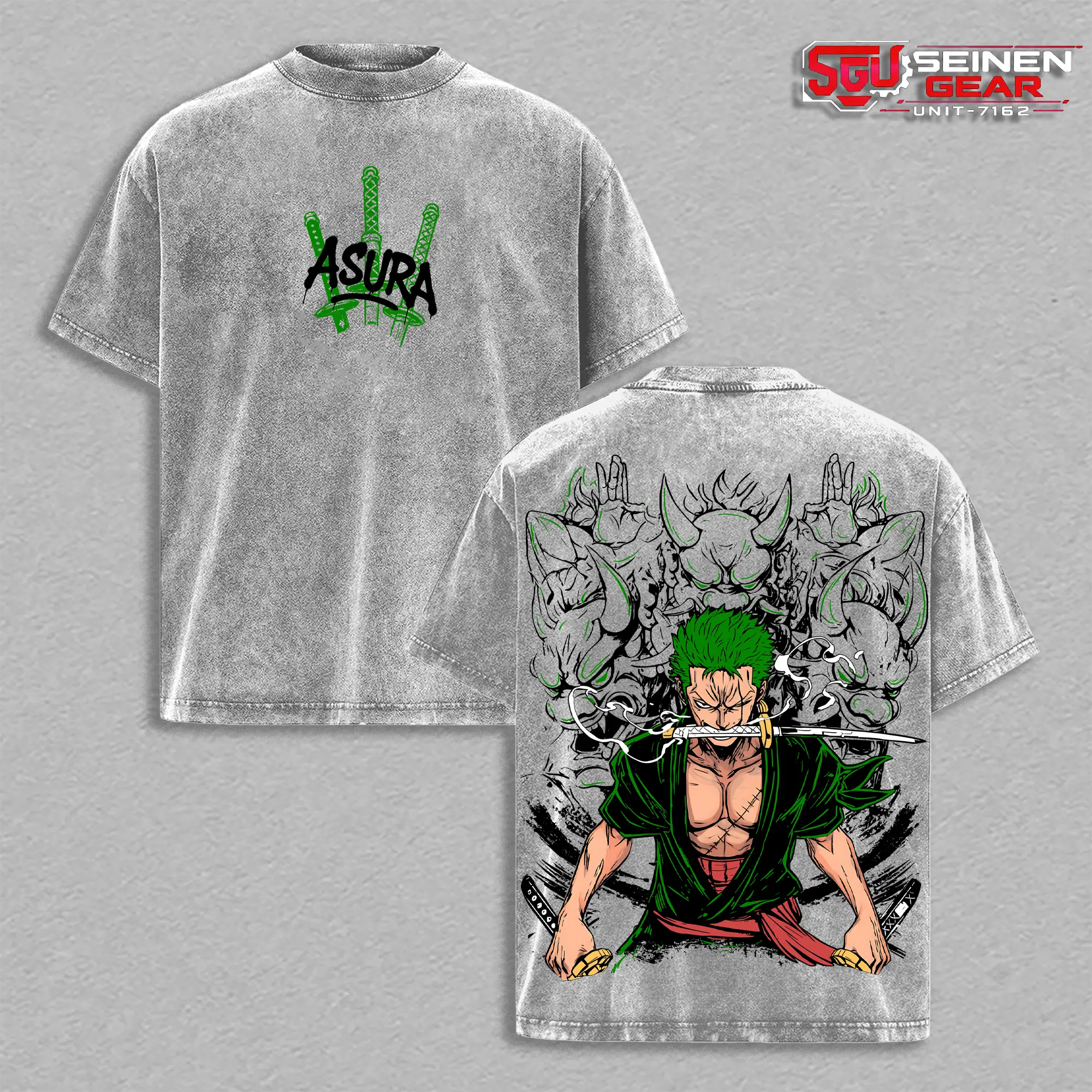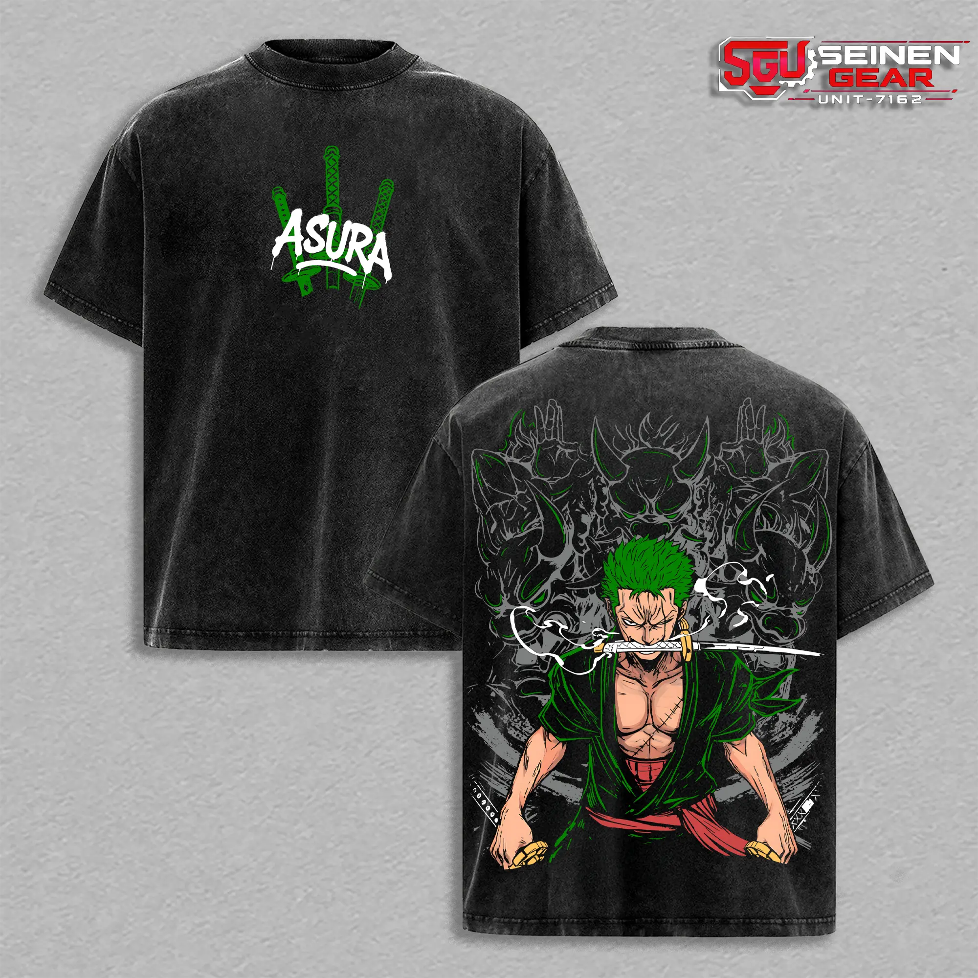 Zoro Asura King of Hell Double Printed Vintage Washed Oversized Tee, One Piece Anime Manga Heavyweight Cotton Graphic Tee Streetwear Gift for Him
