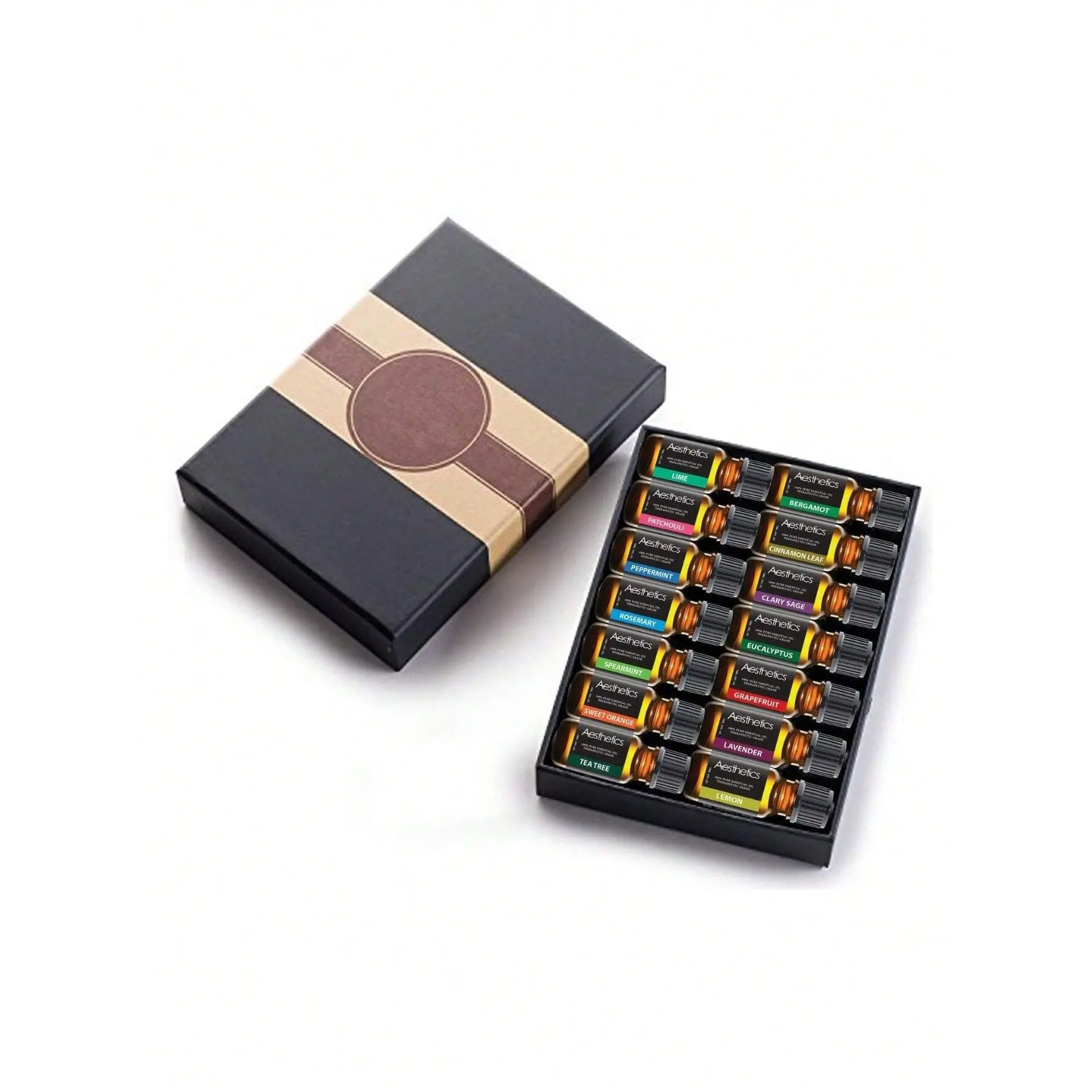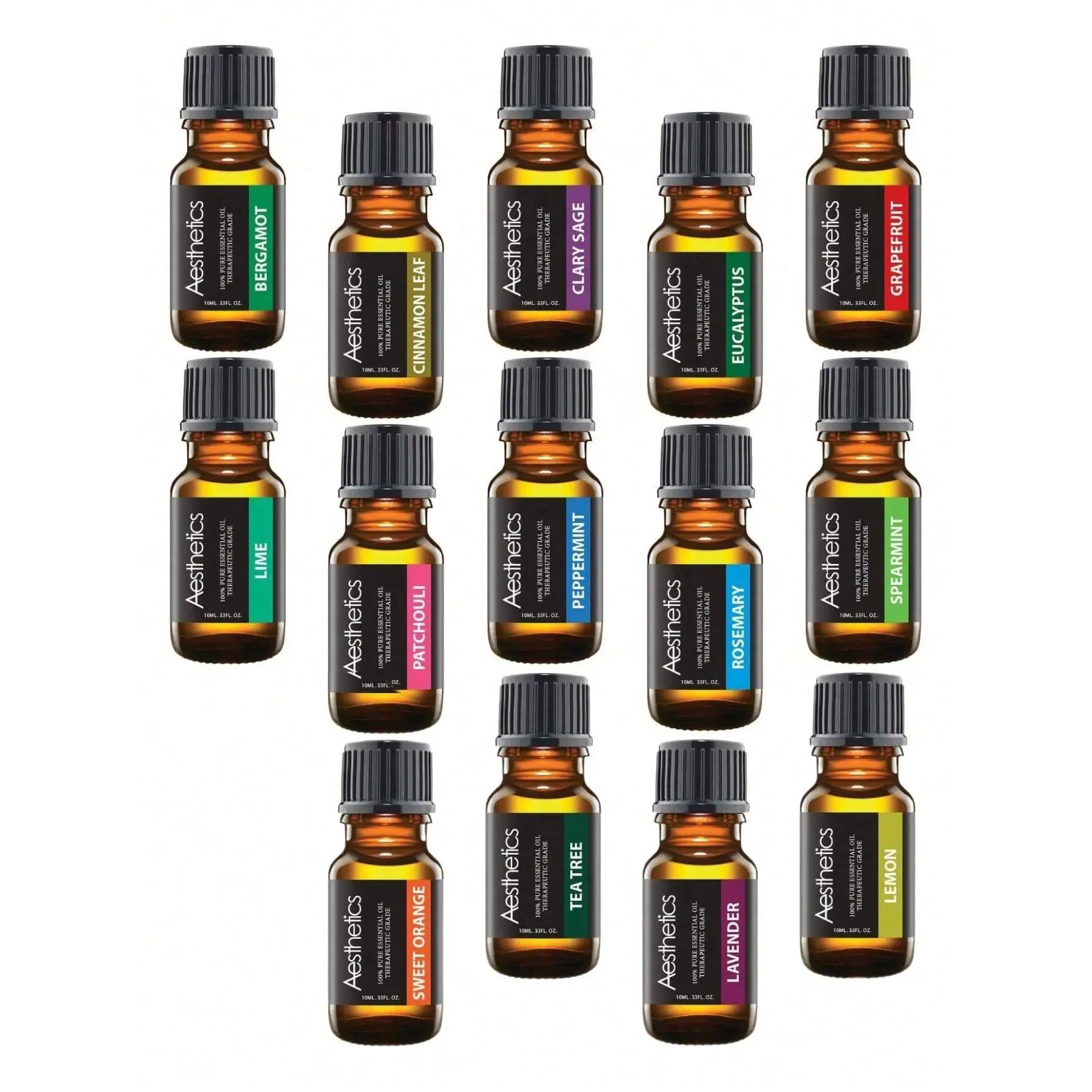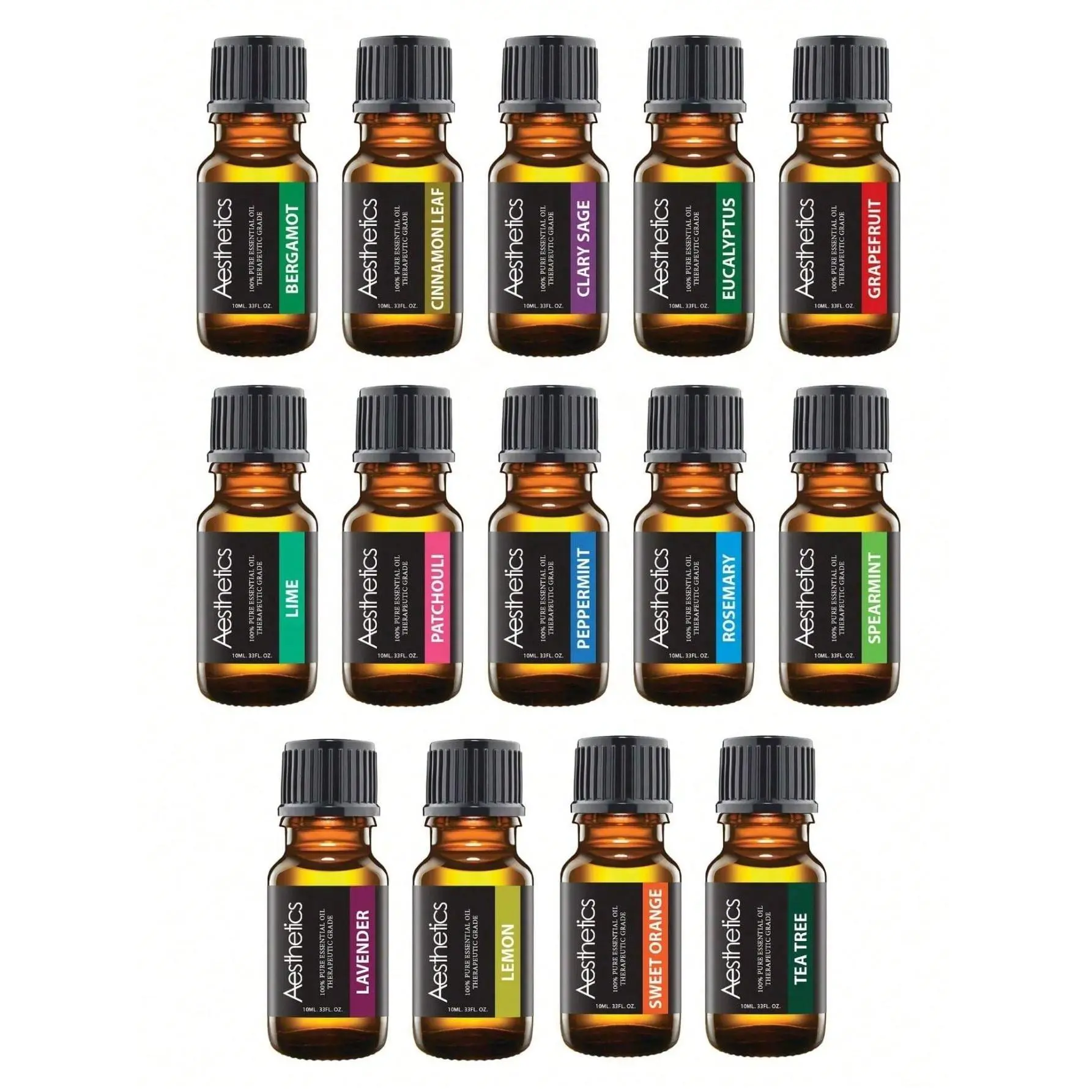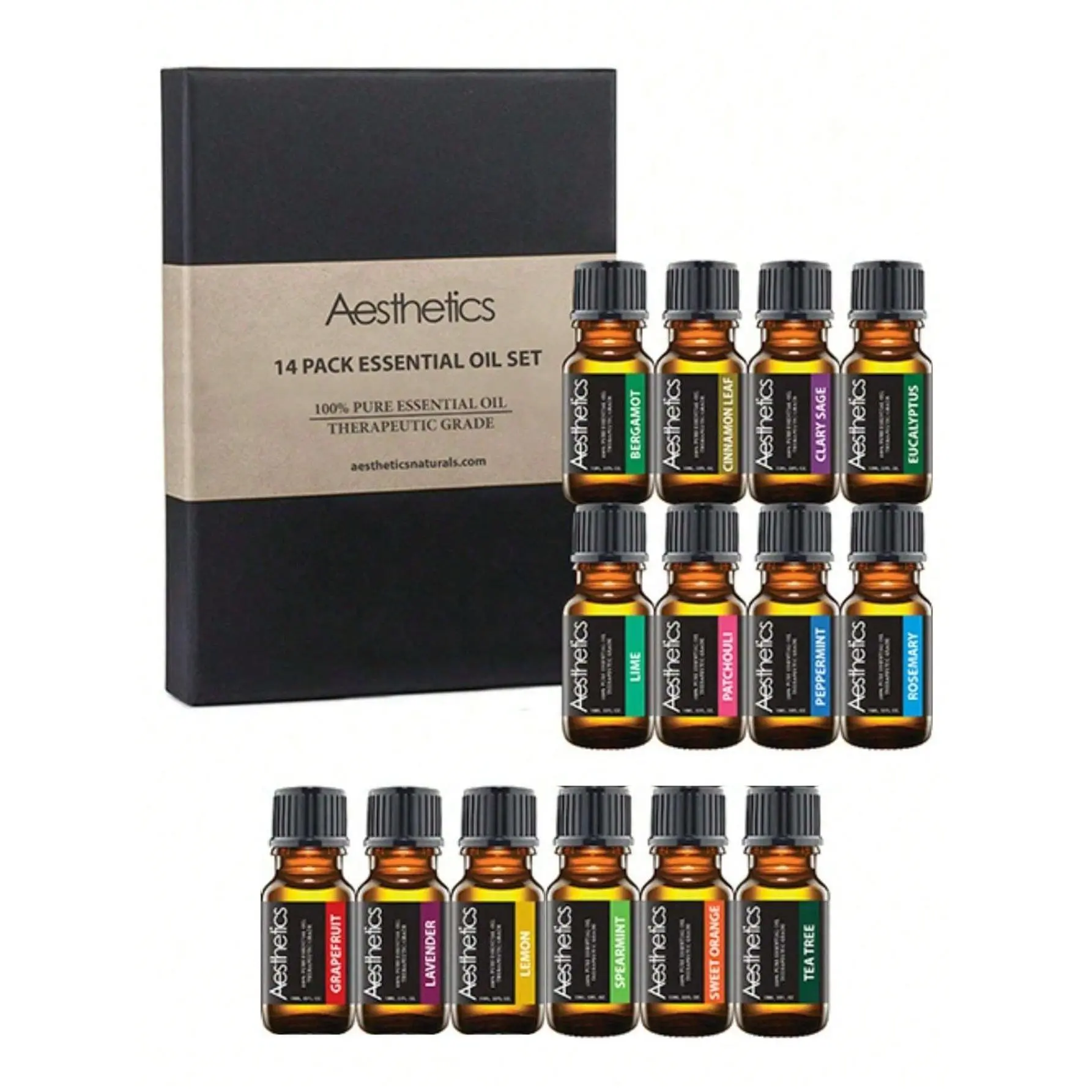 This set includes 14 different essential oils, perfect for natural aromatherapy. Each bottle contains 33 FL.OZ of pure oils. Ideal for those seeking therapeutic-grade essential oils for various uses. The set is designed for aromatherapy enthusiasts.
