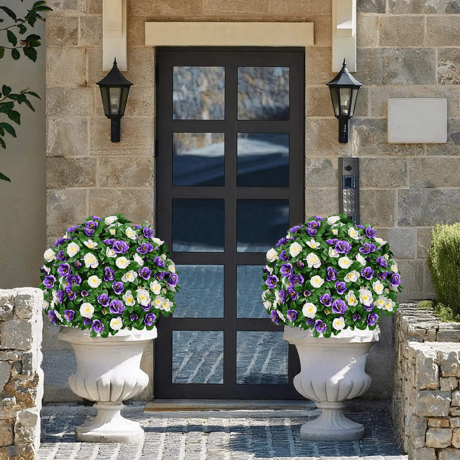 2 Set Artificial Outdoor Flowers Artificial Hanging Flowers Plant UV-resistant Windproof Waterproof Faux flowers with 2 Hanging Basket 2 Hanging Planters 40 Flowers for Spring Summer Porch Home Outdoor Decoration Garden Pot Front Courtyard Patio Lawn
