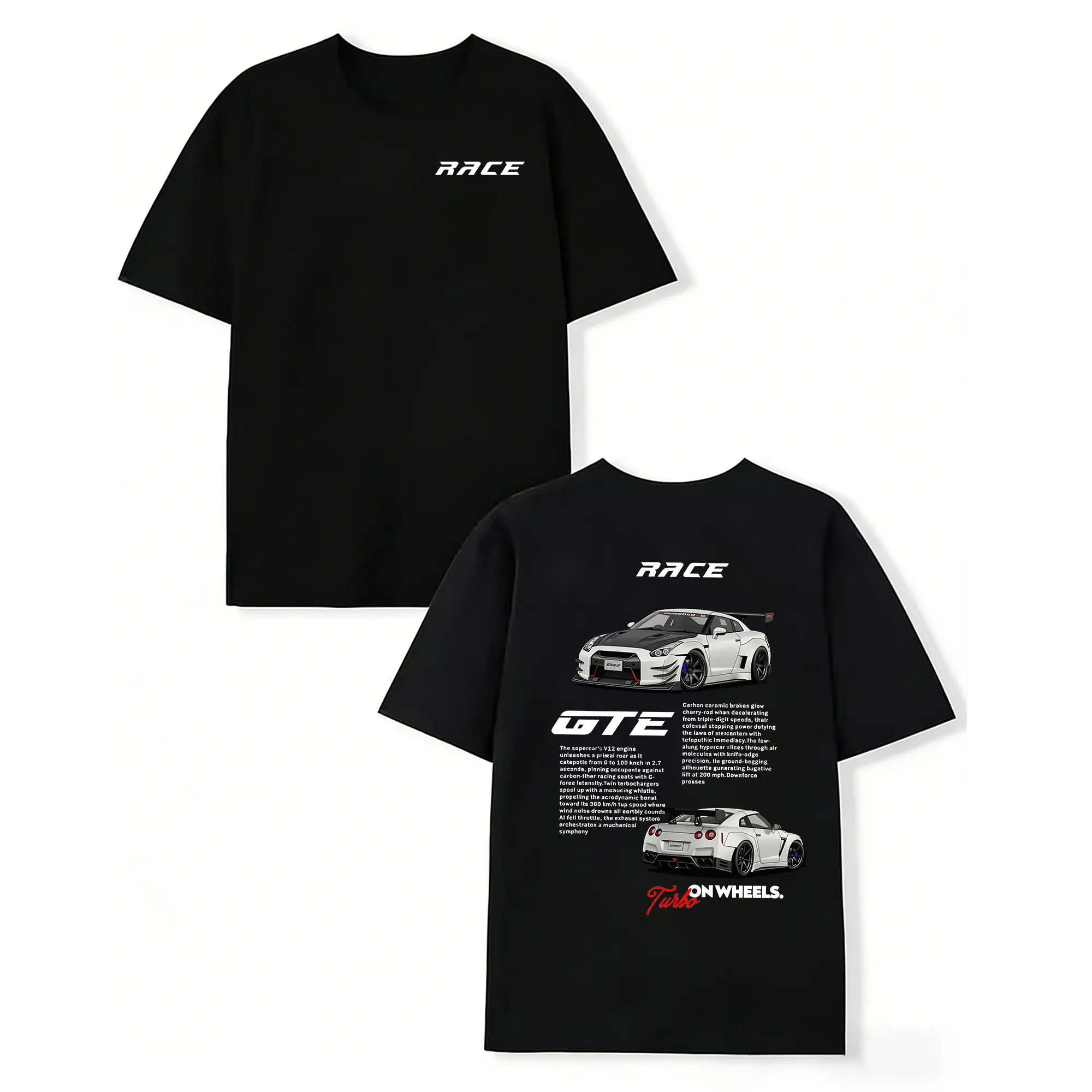 Men's trendy car graphic T-shirt, racing element print T-shirt, loose-fitting street style summer short-sleeved top, suitable for car enthusiasts' casual wear, slightly dropped shoulder crew neck T-shirt.