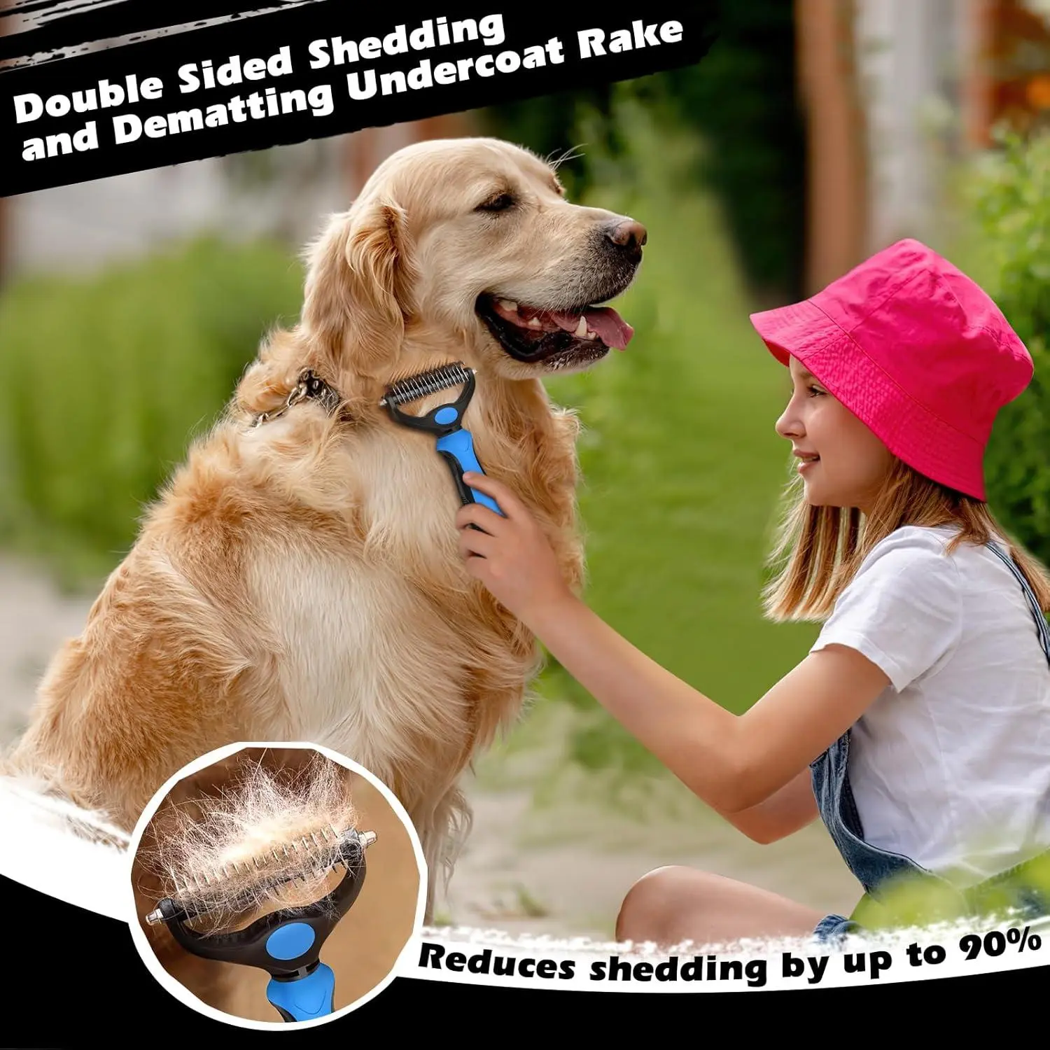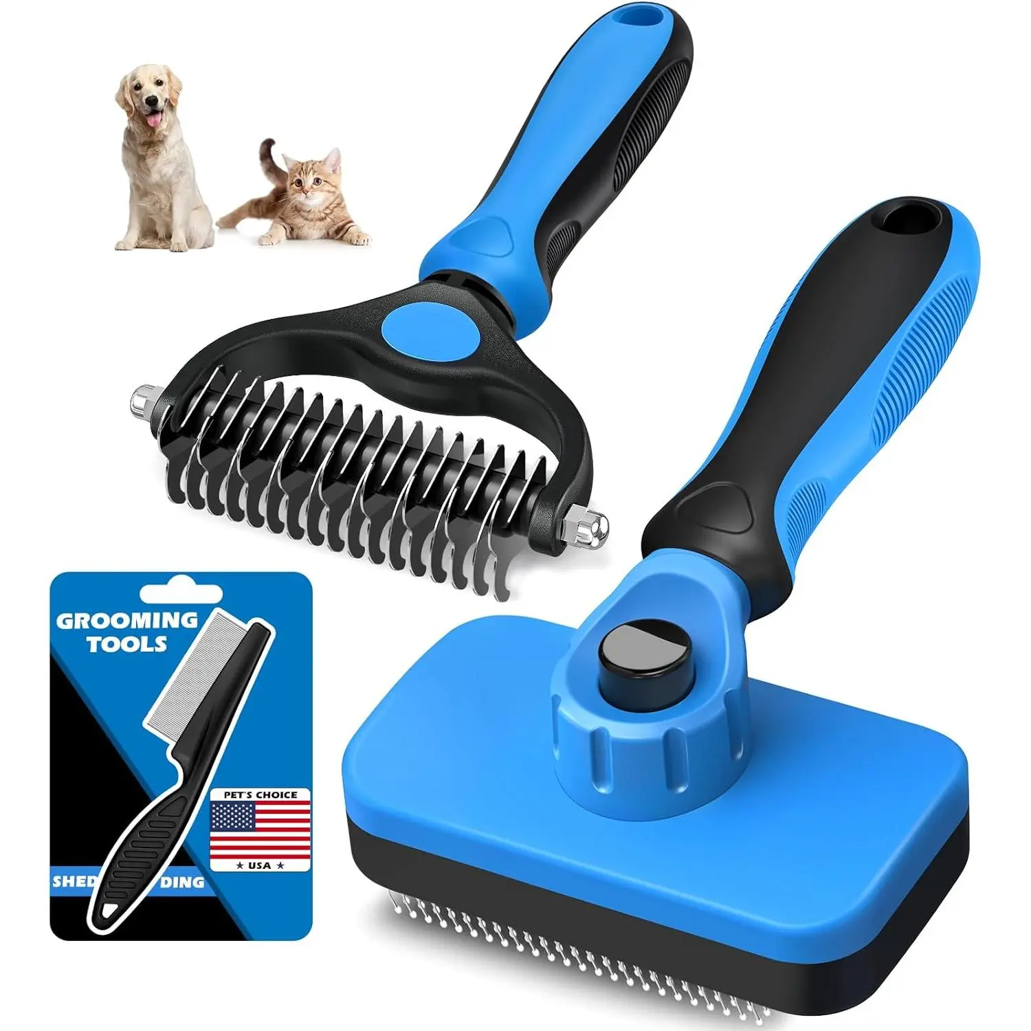 3PCS Self Cleaning Slicker Brush & Pet Grooming Rake & Flea Comb for Dogs, Cats and Horses | Double-Sided Dematting Comb & Skin Friendly Deshedding Grooming Tool | Premium Pet Supplies (Blue)