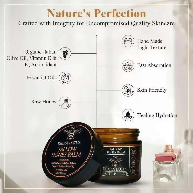 Handmade with care, this balm is an all-natural choice for your skincare routine. It is free from harsh chemicals, making it suitable for sensitive skin. Experience the benefits of organic, grass-fed beef tallow and raw honey in a single, soothing balm.