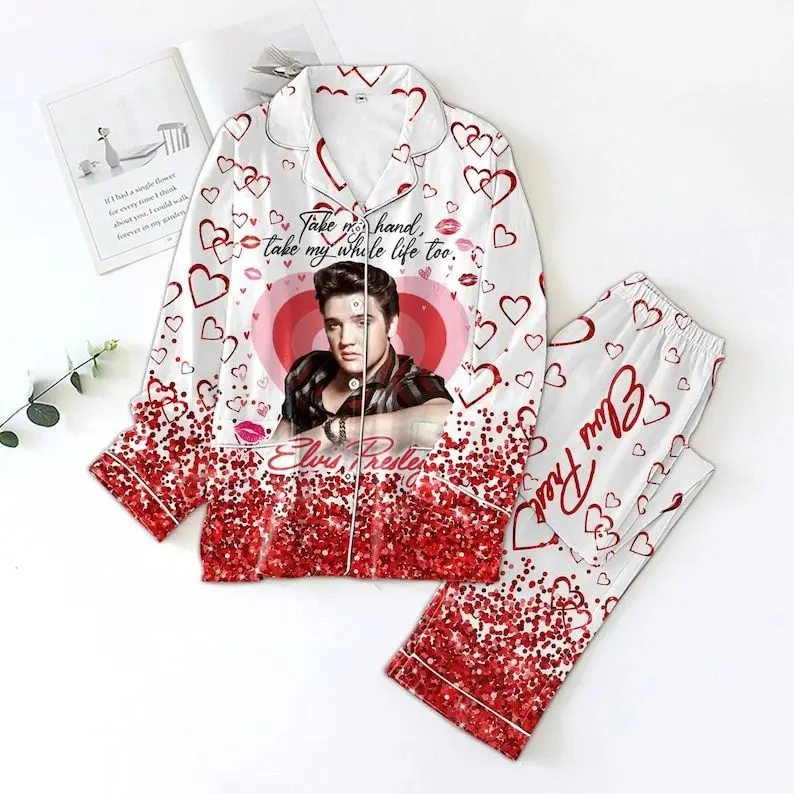 Elvis Presley Valentine Pajamas Set, Elvis King Long Sleeve Pajamas, Rock And Roll Music Bridesmaid Pajamas, Gifts For Elvis Fan Embroidered Cap Pajama Satin Set